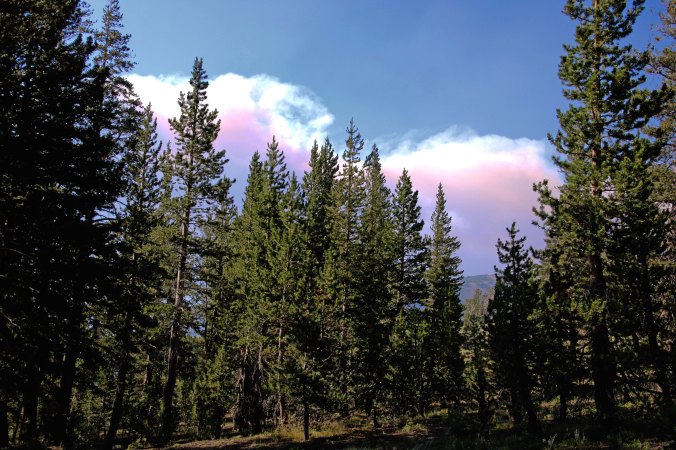 We were fortunate to leave Sonora Pass when we did. Peggy had been watching a worrisome cloud of smoke. It had grown from a small, seemingly insignificant plume to covering a third of the sky. The Donnell fire located a few miles farther to the west on Highway 108 was being pushed by winds and had jumped the highway.  Bones and I had experienced the winds up on the trail around Sonora Peak. I estimated that they were gusting close to 50 miles per hour. Bones had put his pack down to take a photo and watched it be blown along the ground. He scurried to retrieve it. So much for the photo-op. I’d had to lean into the wind to keep my footing, not particularly pleasant on a narrow, high-pass trail with steep drops. But it wasn’t boring.