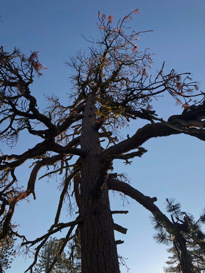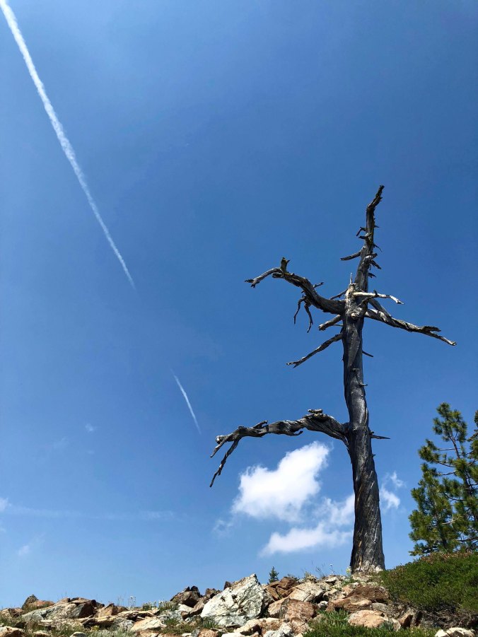 An ancient snag was brought into the modern world by a jet contrail streaking across the sky. It’s unlikely that jets, or even propeller-driven airplanes, were invented when it was a youngster. (Photograph by Jay Dallen.)