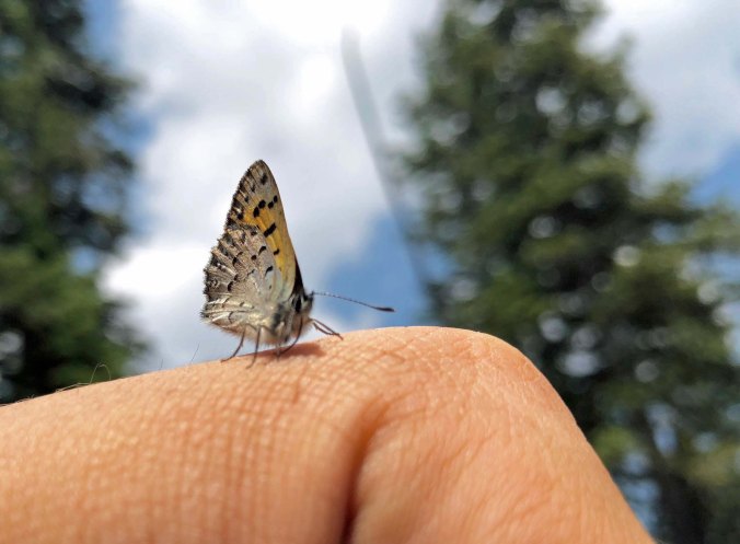 This little fellow decided to visit with Jay and landed on his finger. I might add, he did not want to leave. I had experienced this several time in the Marble Mountain Wilderness. I think the butterflies liked the salt on our skin created by sweating our way up and down mountains! (Photograph by Jay Dallen.)
