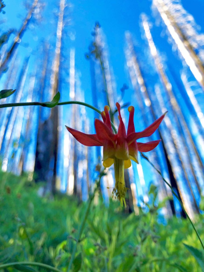 Did Jay take as many photos of flowers as I did? Hard to say, but he took plenty. A stark, burned forest provides the backdrop for this columbine closeup. (Photograph by Jay Dallen.)
