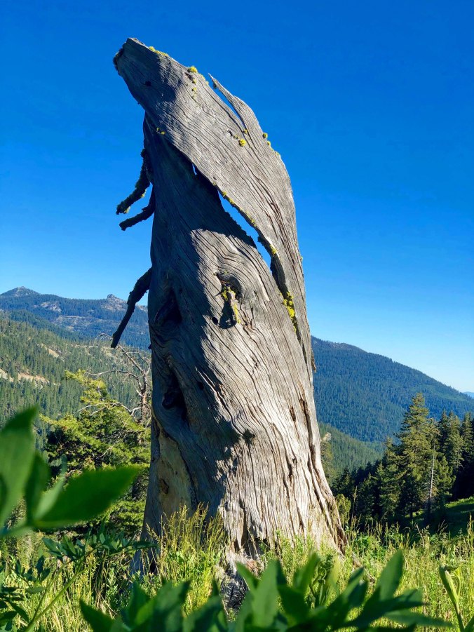 As does the contrast between light and dark with this snag sculpture being set off by the sun on the grass in the foreground. (Photograph by Jay Dallen.)