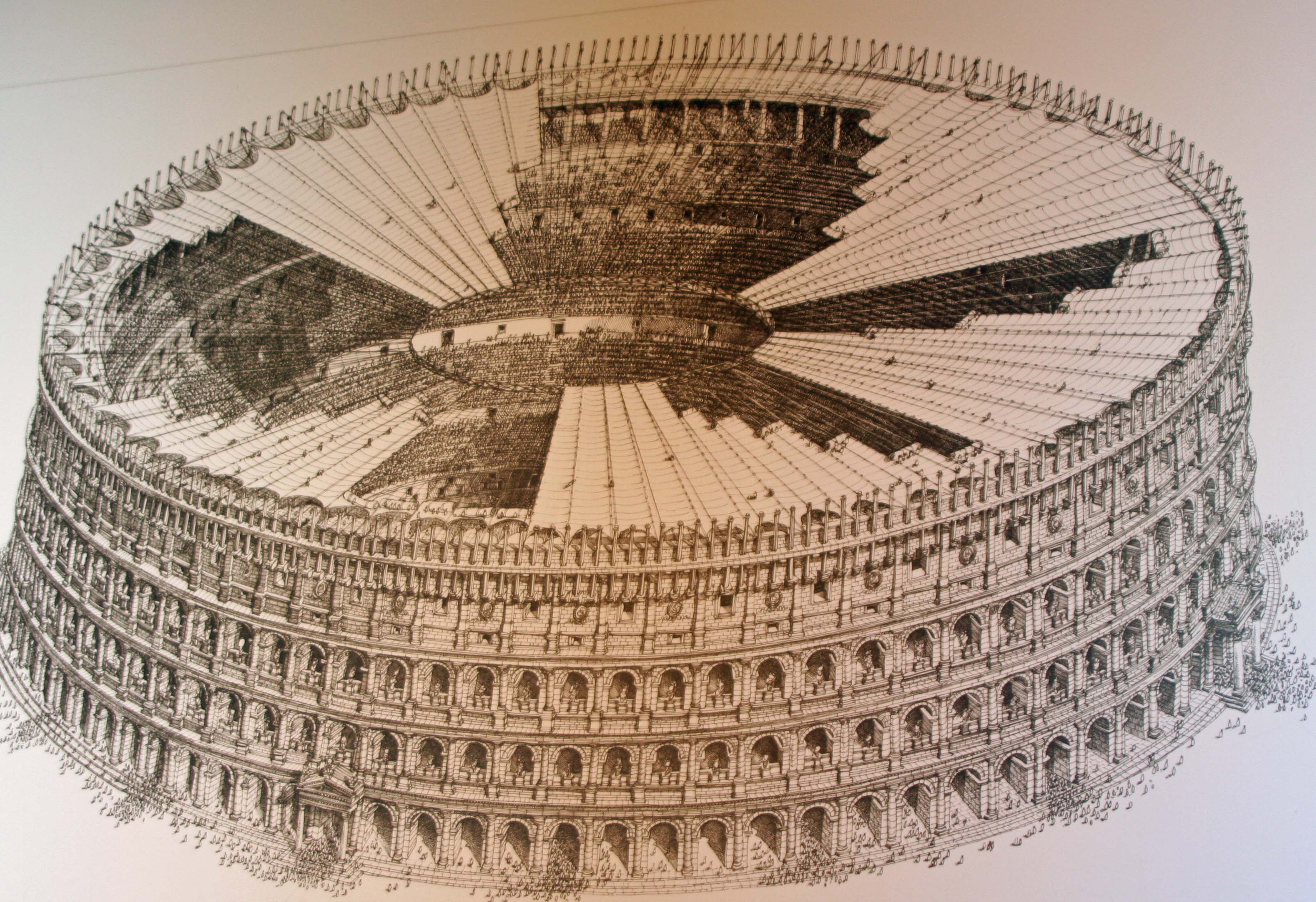 Here’s what the Colosseum would have looked like with its awning. (Illustration from Colosseum exhibit)