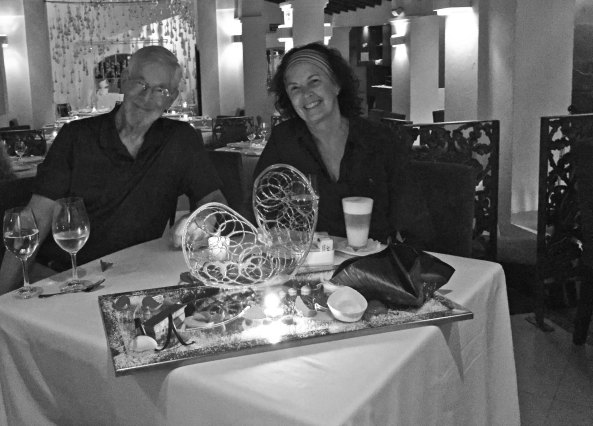 We were greeted with a free drink. Cheers!A free hors d’ouvre arrived at our table next. There were also rose petals scattered on the tablecloth. . I had short ribs in a delicious mole sauce and Peggy had an out of this world duck leg that melted in her mouth.We couldn’t believe it when our dessert arrived on a large mirror platter complete with Happy Anniversary in chocolate surrounded by small dollops of raspberry sauce. A candle lit things up and a large spun sugar heart provided the backdrop! And no, I wasn’t a two-fisted drinker. We had moved Peggy’s glass of wine for the photo. Needless to say, the waiters were well-tipped!