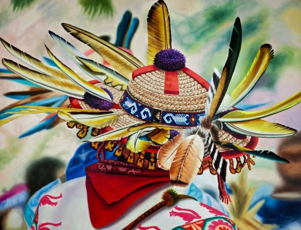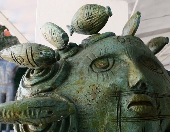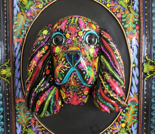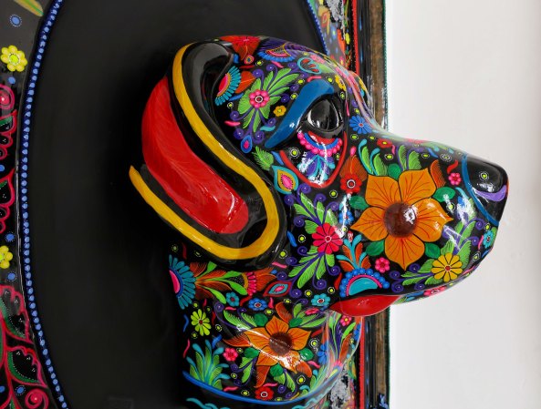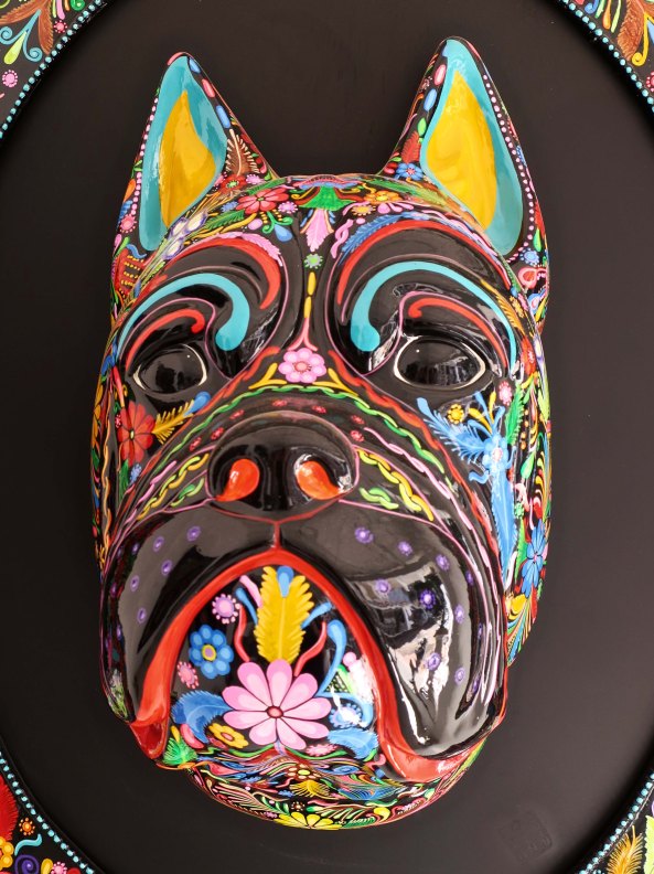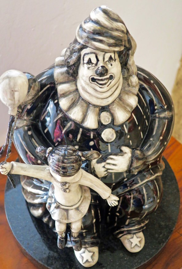 These Mexican Chihuahuas caught my attention immediately.I was reminded of these two cuties we found on Puerto Vallarta’s Isla Cuale a few years ago. It appears that the light brown fellow was getting an earful! Maybe he forgot to take the garbage out. Obviously, he cares. Grin. (Actually, he was about to get his ear bitten. Teach him.)The gallery featured several other colorful dogs in three dimension. I’m thinking boxer, here.A profile shot!This one reminded me of a cocker spaniel from my youth.The obvious companion to the sculpture I opened the post with. The shadow seemed a little sinister to me, like an evil twin sister. And what’s with the sort of scorpion, sort of cat, sort of person on her hand? This was one of Peggy’s favorites in the way the eyes, mouth, teeth and tongue stood out, becoming almost real in comparison to the rest of the painting.Peggy also was drawn to this hat with its many feathers. I found it almost surrealistic in its intensity.Are you a person who finds clowns scary? The little girl with her balloon didn’t. The triple chins suggest a bit too much fast food!I liked the colorful bull although the eyes suggest it could have been a member of the devil’s herd in “Ghost Riders in the Sky.” (One of my favorite songs when I was growing up.)Remember Senior Fish Head from my post on the Furniture Mart. This fellow seems to have a similar problem with fish on the brain. I’ll close my section on the Corsica with this sculpture. I found it quite unique. You can learn more about the gallery and its artists by visiting its website: Corsica Galeria de Art