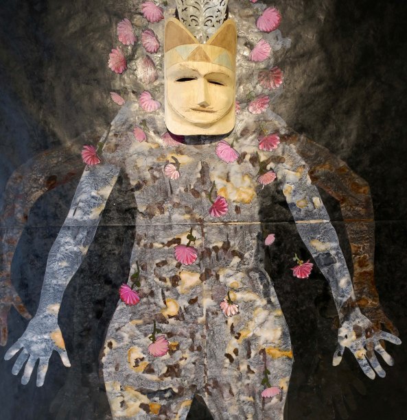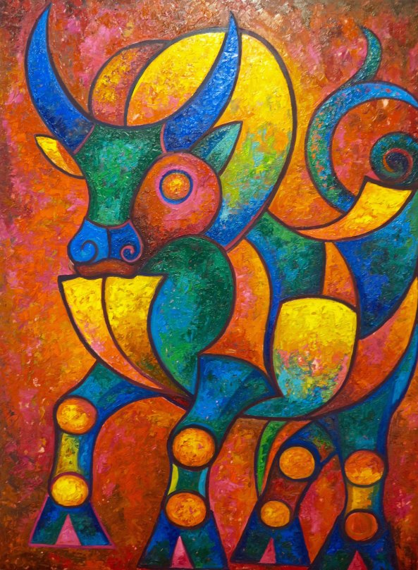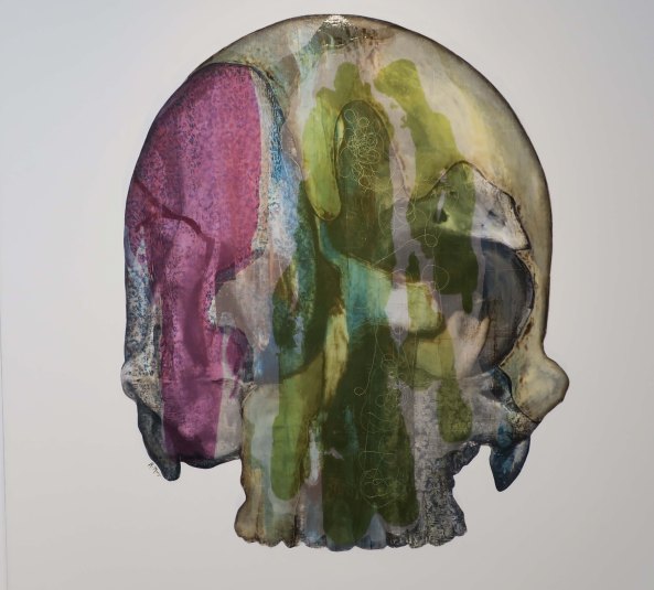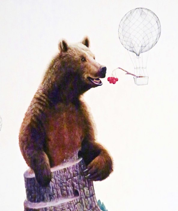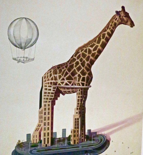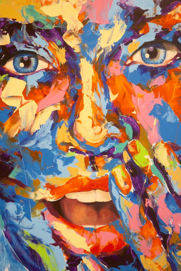 I felt that this fellow could have been found hanging out in the woods of ancient Greece.One artist used hot air balloons to connect his paintings. Here the balloon is offering cherries to the bear. Knowing what I know about bears, it is about to gobble them down.This giraffe is either coming out of or morphed into a city, giving a new meaning to the term skyscraper.Alligator with companions on a unicycle? I’ll bet the artist has some very creative dreams. What would Freud say…Mixed medium skull. I’m starting to think Day of the Dead. (Next post)I am not sure whether cat woman is facing forward or backward, but she was colorful. Note the extra pair of arms. I blew this photo up and found bears, owls and rabbits staring back at me. But as you know, I have an active imagination and I am pretty sure that the artist was okay with me seeing whatever I wanted to see.More eyes staring at me. Is that a come-hither pose? Or is it Blake Shelton saying ‘choose me’ on Voice.. And finally, i was quite taken with this collage of floral images. I couldn’t find a website for Galerie des Artistes but apparently the gallery is on Facebook.