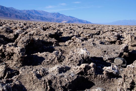 The shallow Lake Manly filled the basin a few thousand years ago. As the climate of the area changed and became more desert like, the lake dried up. Its briny waters left a deep deposit of salt behind, which brings us to today’s post. The Devil’s Golf Course is located a short 10 miles away from Bad Water Basin, which, at 282 feet below sea level, is the lowest point on the North American continent. Water that drains into the Basin melts the salt and becomes undrinkable, thus the name. The Devil’s Golf Course is several feet higher and avoids the melting water. Instead, capillary action pulls salty subsurface water up creating the crystalline structures that the area is famous for.