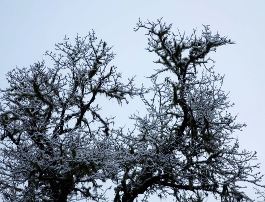 If the rooster seemed cold, imagine what the frog my brother bought for our bird bath turned deer watering hole was feeling. And believe me, the deer were not happy that their spring was frozen solid.I always start my snow walk by looking out from our patio at the distant mountains, if they aren’t socked in. Peggy and I hiked around the now white Red Buttes last summer as part of my journey down the PCT.Then I check out other views from the patio. This is looking down across the hidden Applegate River through our white oaks at Douglas firs across the way. Another view across the river canyon with the sun peaking through. Having satisfied myself that things are beautiful out front, I walk up our road to the Rogue River National Forest that forms the back boundary of our property. White oaks provided dramatic silhouettes from the road. And a snowy wonderland up close.We call this old fellow that lives in the National Forest the Lord of the Rings tree. We’re convinced that elves and hobbits find it a pleasant place to hang out.Different trees hold the snow in different ways. This is the Douglas fir ‘look.’And this is a ponderosa pine.A closer look at the ponderosa with its snow.Twisting and turning white oak branches covered in snow always provide a photo op.Group shot! The short guys are up front.And I will close today with this one featuring white oaks and a ponderosa pine.