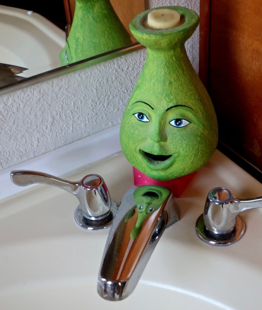 Our daughter Tasha gave me this. It sits on the edge of our bathtub with a continual look of shock and amusement on its face. I like the way it is reflected in the faucet.