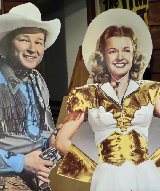 This cut out at museum may suggest why Dale was able to smile while Trigger was stealing the show. It appears that Roy is holding a gun on her!
