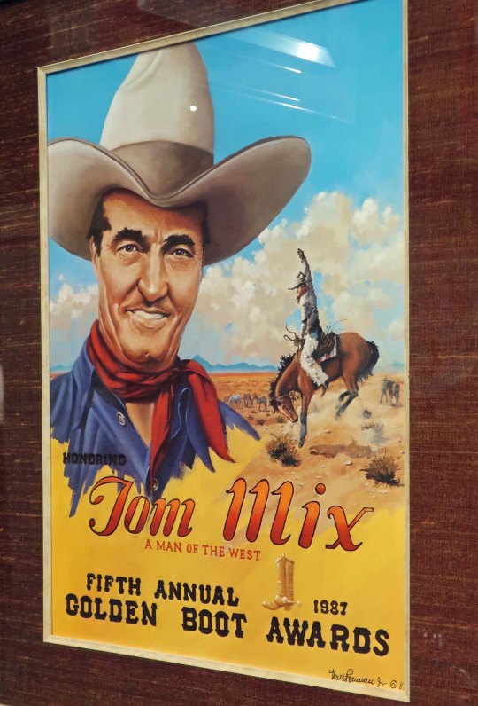 Tom Mix was recognized for his extensive role in the development of movie Westerns with the Golden Boot award. The bucking bronco in the background reflects his rodeo connection.