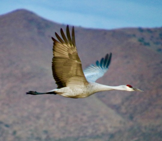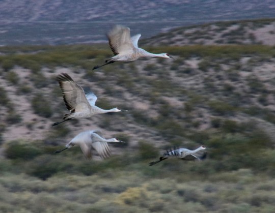 Necks straight out with feet trailing, hundreds of sandhill cranes took to the sky as they began their early morning launch in search of food in the middle Rio Grande Valley of New Mexico. Later in November, their numbers will be climbing to the thousands at the Bosque Del Apache National Wildlife Reserve just south of Socorro. We had watched long lines of the cranes flying back to the reserve the night before, burbling away in long lines, and were eager to witness the phenomena.