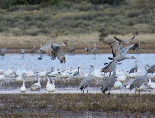 In fact, the geese didn’t quite get the program and were landing instead of taking off. They would soon join the cranes in flying off, however. (Photo by Peggy Mekemson.)