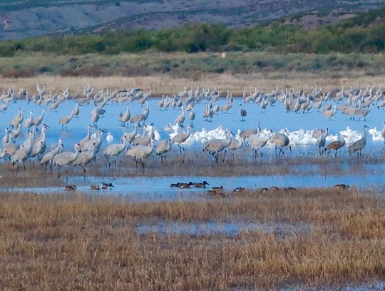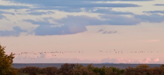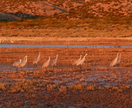 The night before, we had watched long lines of sandhill cranes flying into the reserve after a day of feeding along the Rio Grande. Enlarging this photo, I counted close to a hundred cranes in this picture alone.