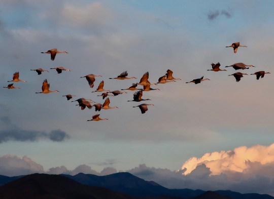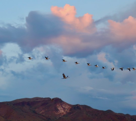 The light changed rapidly from 6:30 to 7:00. The cranes are all moving forward, long legs stretched out. (Photo by Peggy Mekemson.)