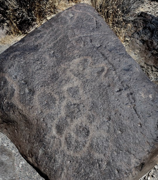 The most mysterious to me was this horse-like figure. Horses went extinct in North America around 11,000 BCE and weren’t reintroduced until the 1500s CE. Petroglyphs at nearby Pyramid Lake date back to 10,000-14,000 BCE, however, so horses could have been around then. Maybe we are looking at a dog, coyote or wolf. Or maybe none-of-the-above.