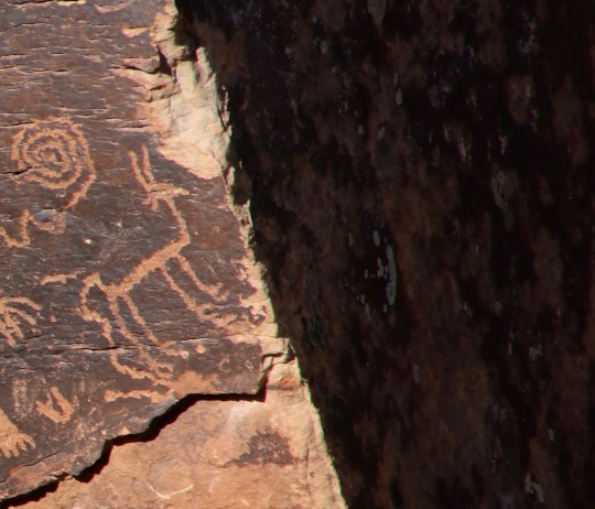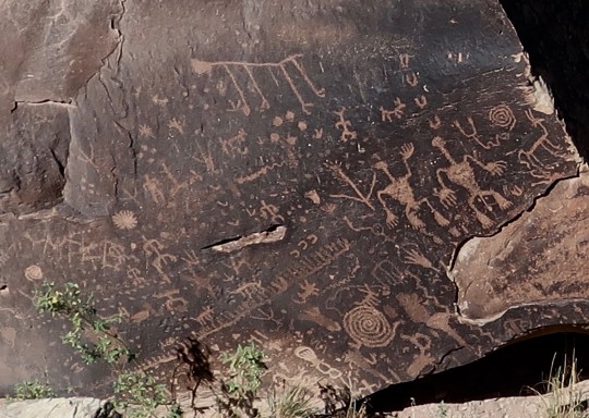 The circles and wavy lines represent some of the oldest petroglyphs found at the site. Rock art is made by using a rock to peck away the dark, desert varnish that covers rocks exposing the lighter colors underneath. You’ve seen many examples on my posts over the last three weeks. These petroglyphs are almost the color of the rock, which means that the desert varnish has had time to cover the rock art, literally thousands of years.