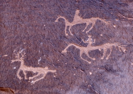 Here we have a much more recent petroglyph from Canyon de Chelly showing Navajo hunters in pursuit of a deer. Note how light the petroglyphs are in comparison to Grimes Point.