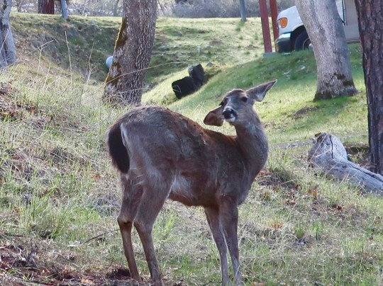 I was walking up to my writing place on the edge of the national forest when I ran into Floppy. “You are looking a little pregnant, Girl” I told her. She gave me the look and laid back her ears. “There is no such thing as being a little pregnant, Curt” she said primly in deer language. And she should know. She’s been dropping babies on our property for the past several years.