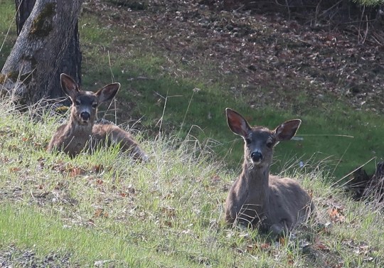 Her two teenagers were hanging out in the grass 10-yards away. Floppy has been urging them to leave home lately. I saw one dashing down the hill yesterday with Floppy hot on its heels. This isn’t cruelty; it’s normal doe behavior. Floppy is about to have her fawn and the teenagers hanging around will give away its hiding spot to any number of predators.