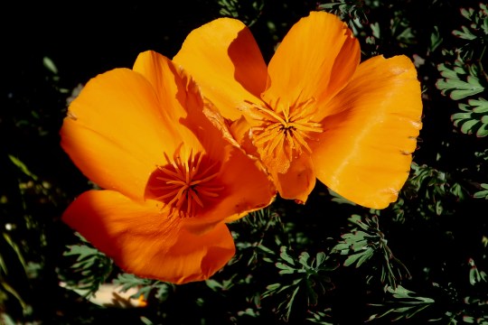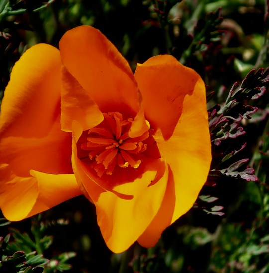 • There is no doubt that California poppies love the sun, Dave. I went out and checked them yesterday in a rainstorm and they were closed up tighter than a clam! –Curt