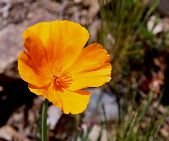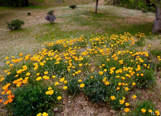 Peggy and I are continuing to hike around our five acres and the Rogue River–Siskiyou National Forest that abuts the back of our property. It serves as a form of entertainment and exercise during our ‘sheltering at home.’ On Monday I featured white oaks with personalities. Today I had picked out ten flowers to feature but the California poppies (Eschscholzia californica) growing down our hill in ever-increasing abundance demanded their own post. These guys produce a gazillion seeds (something like 100,000 per ounce) and are a bit aggressive. Since they are invading territory previously occupied by star thistle— in serious competition for being the world’s most obnoxious plant— we encourage them to invade away. Go, poppies, go!
