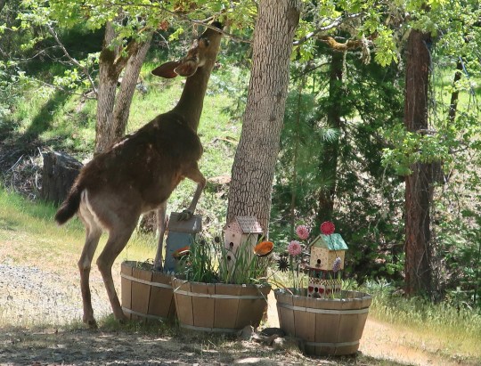 A gray squirrel slurps up water while its companion looks on…And then joins in.Although there is a natural spring down in the canyon, the deer seem to prefer the bird bath. We’ve learned that one deer can drink a lot.And two drink a lot more. Peggy and I are constantly refilling the ‘spring.’Let me introduce Young Buck. His antlers are just beginning their growth spurt. He’s a handsome fellow.And a bit full of himself. If he looks like trouble, that’s because he is. Consider the following:We work hard to keep the deer away from our plants. One solution is planting things they don’t like. The poppies I featured last week are an example. Lavender is another. Our garden has a ten-foot high fence around it! And this is what I call the Maginot Line of deer barriers. Peggy and I built these Gabion cages several years ago. No deer had ever leapt over them. That is until……Young Buck. He jumped over the Gabion cage barrier, scrambled over the cement block wall behind it, sampled the newly plated honeysuckle and leapt over the seven foot dirt wall beyond that. Three times. The last time I had a discussion with him on how delicious venison stew is. Peggy and I also added another small fence. So far, he hasn’t jumped over again. But with him, there aren’t any guarantees. The other deer just stand around and watch in awe, waiting to see what happens. Normally lots of yelling, “BAD DEER!”Having shown a bad deer, I’ll conclude today’s post by showing a good one eating Mekemson-approved deer food, young oak leaves. The problem here is that the deer was using one of Peggy’s planter villages as a ladder. She had been wondering why her houses and elves kept ending up on the ground!
