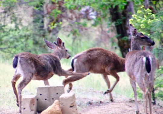 “I warned you. Now you pay.” Note how other deer slip in to grab a bite while the confrontation is taking place.“Not so fast. You may be larger but I have bigger antlers!” Ah, the agony of defeat when the small guy kicks your tail.