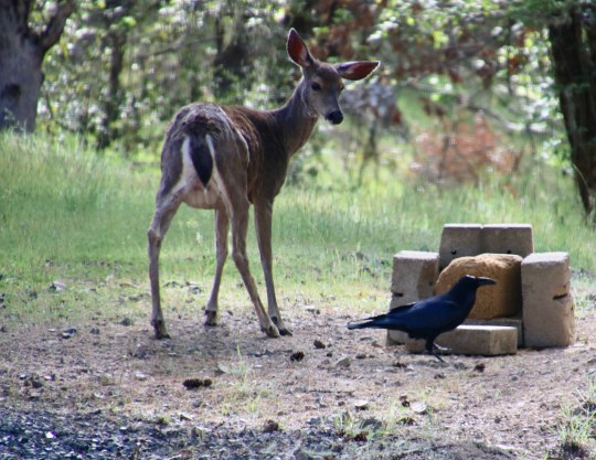 Other animals and birds also like the deer blocks including ground squirrels, jays, turkeys, and acorn woodpeckers. In this particular instance, a raven has come to visit. It’s the first one I have ever seen on our property. Judging from Momma-to-be’s reaction, it is the first time she has ever seen one either! Her expression says, “Who and what are you? And what do you intend to do with my deer block?”