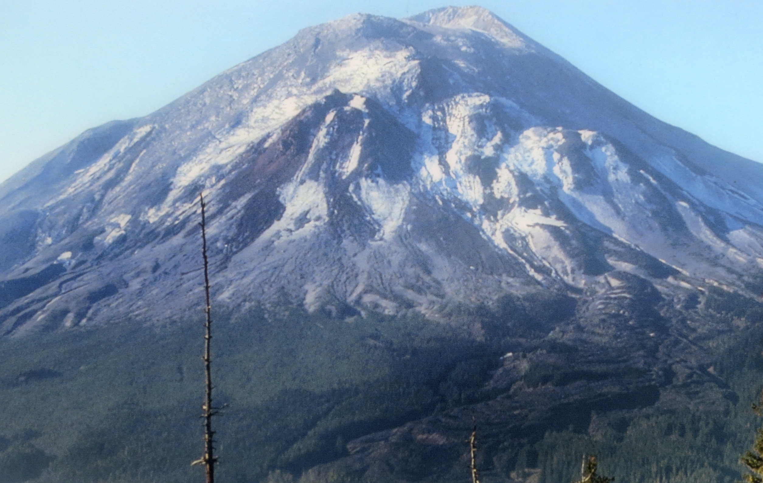 This photo on display at the Mount St. Helens National Monument shows the mountain before the explosion.