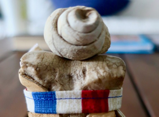 Bone, wearing his Covid-19 mask, took an immediately liking to the fossilized snail. I think that he decided that the snail would make an excellent Texas hat! I told him that it made him look jaunty.
