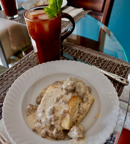 “You have to try my biscuits and sausage gravy,” Frances insisted on Peggy’s birthday morning. “It’s a true Texas dish.” And it was delicious. I gained a pound just looking at it. Frances is a great cook. Breakfast came with Bloody Marys that John made. “They are light on vodka,” he assured us. “Only 25%.” Hmmm, they were BIG Bloody Marys. Light probably meant a couple of shots. At least.