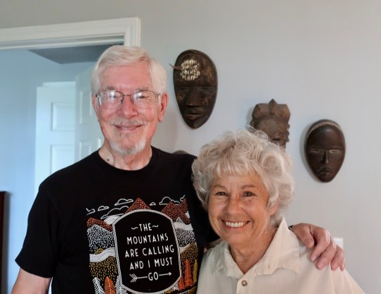 When Peggy and I walked into her house, I immediately noticed Liberian tribal masks on her wall and decided we had to have a photo with them as a backdrop. There was also Liberian country money on display. Even more significant to me, she had a wood-carved crucifix from the leper colony in Ganta. If you have read my book, The Bush Devil Ate Sam, the carving of the bush devil featured on the front also came from the colony. It’s possible that Freddy the Carver did both of our pieces. My friend Morris Carpenter, who served as a Peace Corps Volunteer in Ganta and introduced me to Freddy, had a crucifix from him that looked quite similar to Linda’s.
