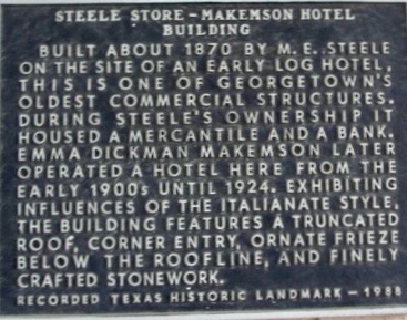 A Texas historical marker provides background information on the Steele-Makemson building in Georgetown.