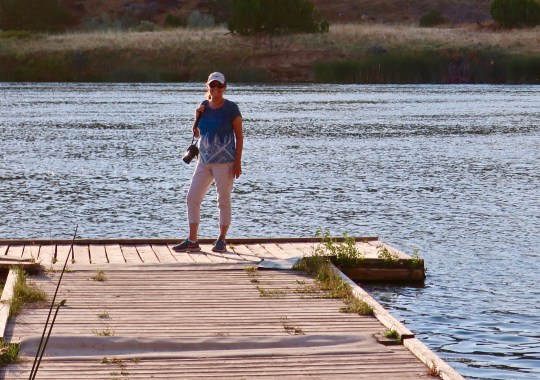 Peggy demonstrates just about the right amount of distance to stay away from us after our journey through 18 states noted for their Covid-19! She is standing out on a floating pier on the Snake River, enjoying the beauty of the area.