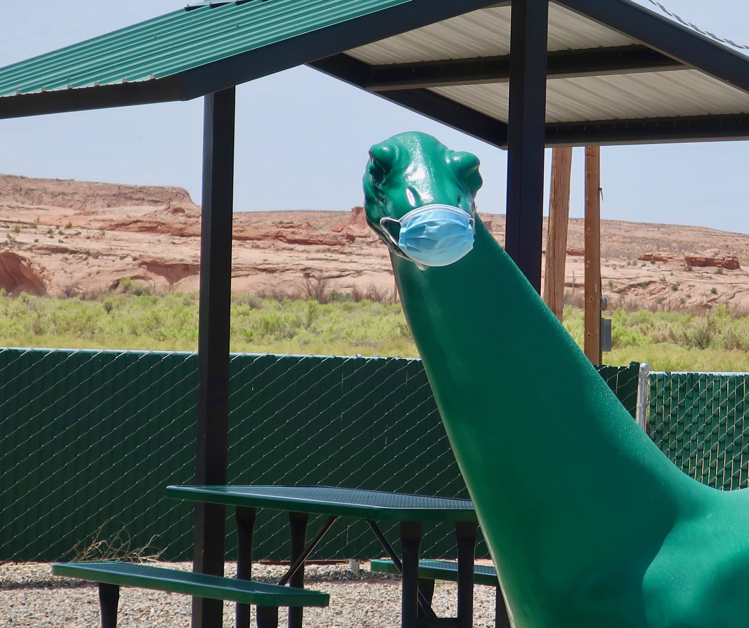 As we entered the Navajo nation, the concern over Covid 19 was immediately apparent. This dinosaur was wearing a mask at a service station.
