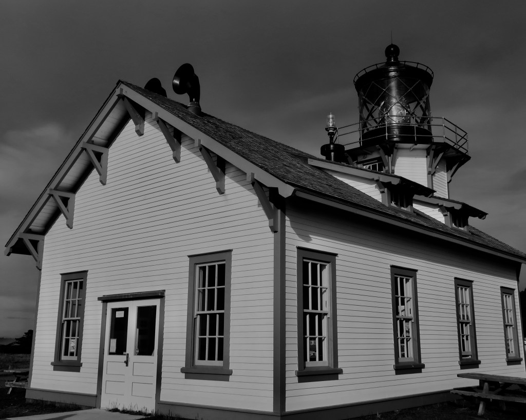 Today, many of the original lighthouses have been turned into museums. That’s the situation with the Point Cabrillo Lighthouse which is now part of the California State Park system. The lighthouse got its official start with a party in 1909. The head lighthouse keeper invited all of the neighbors within a mile over for its official opening at midnight. It was a pea soup night with the fog so thick that the light couldn’t escape. That wasn’t a problem for the loud new fog horns that started blasting out their warning on the dot at 12, probably waking up everyone who lived further away and wasn’t invited to the party. The lighthouse operated happily until 1961 when one of the towering waves I mentioned above rolled over the top. The third order Fresnel lens wasn’t damaged, however, and the lighthouse was returned to working order until 1973 when the US Coast Guard replaced it with a rotating beacon on a metal stand and the original lens was covered.