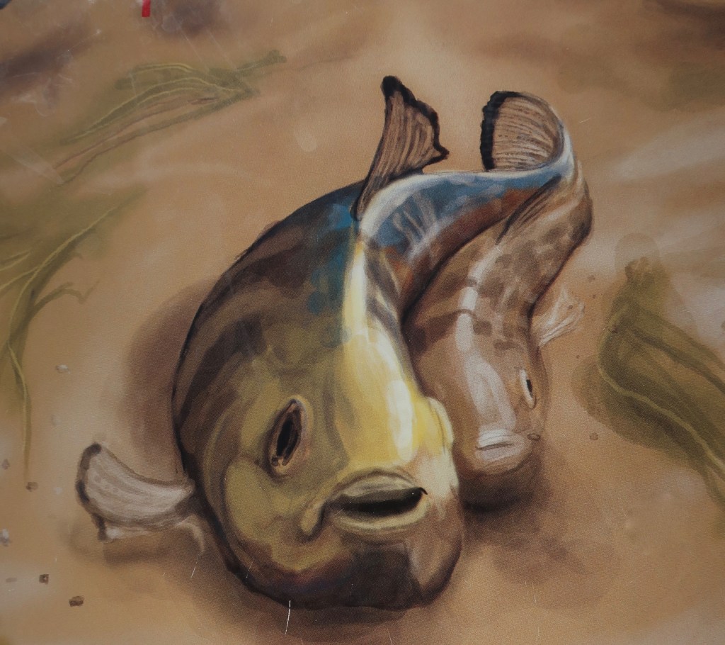 An information panel gave an artist’s rendition of a happy couple. “But where’s the blue?” went dashing through my head. Remember the old “Where’s the beef?” commercials. Okay, I admit that there is some blue, and it is on the male. The panel described the mating process. And it isn’t even R-rated. A female arrives in the males territory, swims over to him, and snuggles up to his side. They start shivering in anticipation, and zoom, she’s pregnant. Just like that. I’d say something about being premature but apparently, that’s how it’s done. “Was it good for you, honey?”