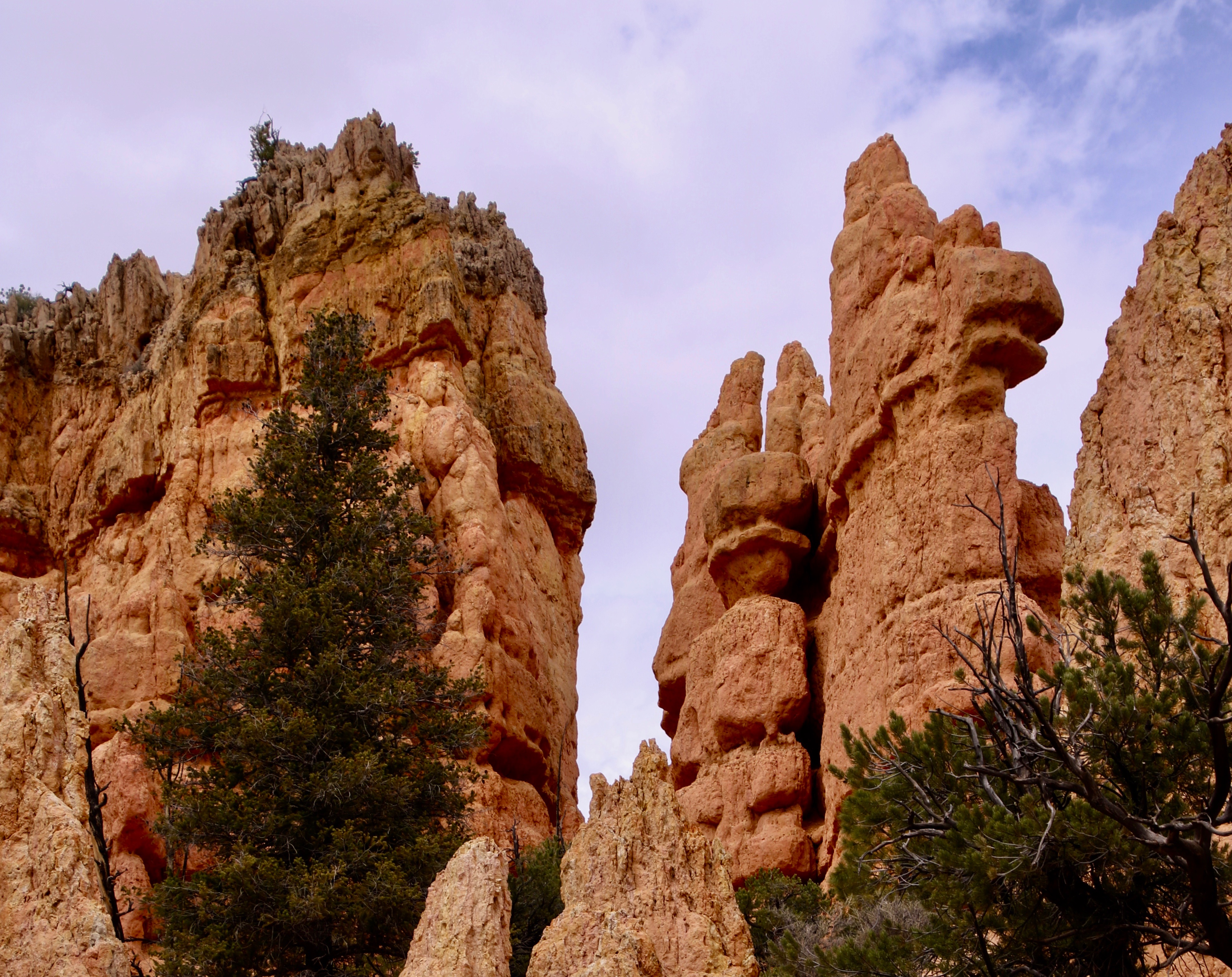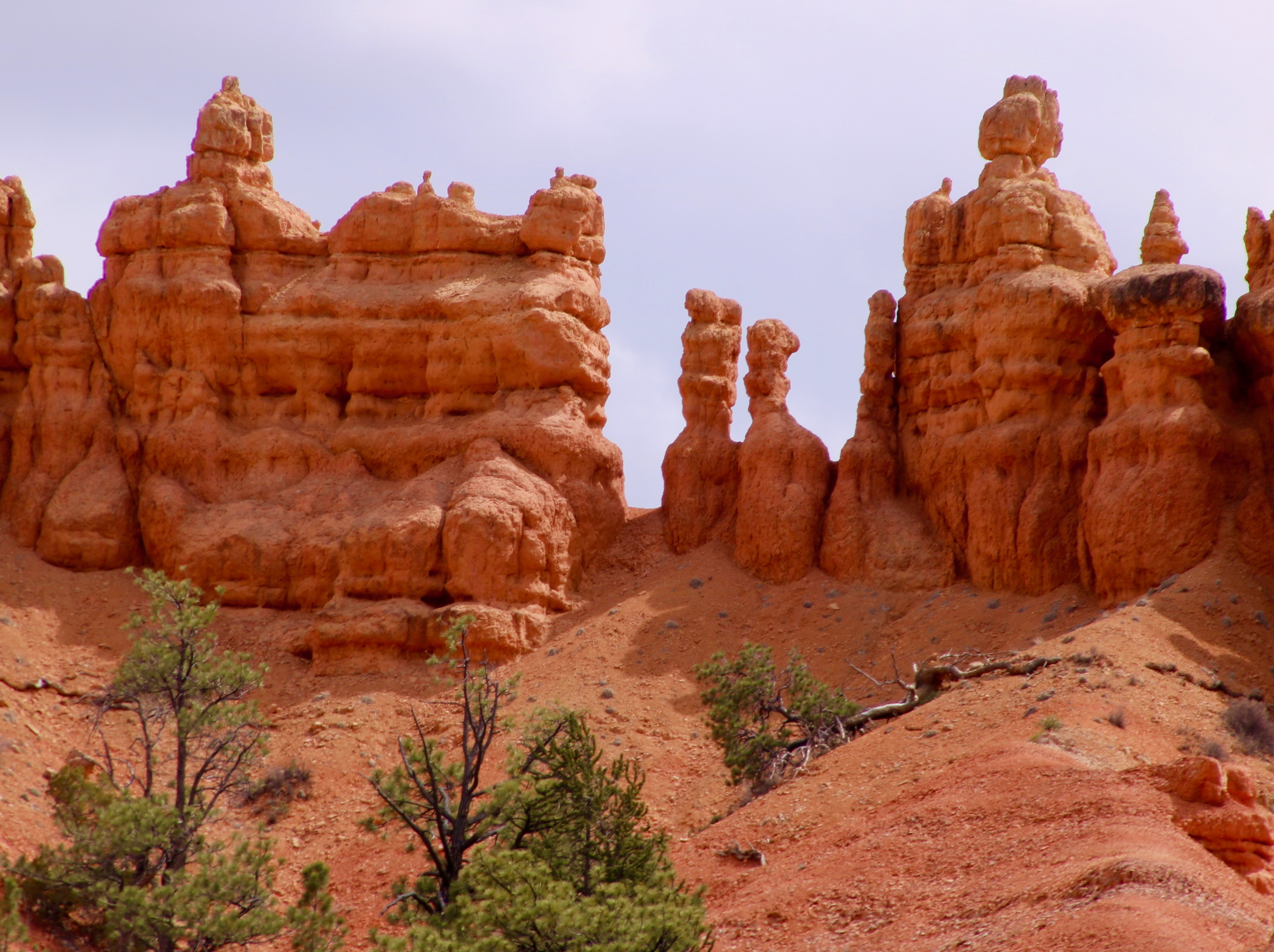 These two hoodoos were among our favorites. At first we thought they were called totems, as in totem pole. Looking at photos in Goggle, I discovered that most people called them salt and pepper shakers. The sun was lighting them up under dark skies, creating a dramatic effect.