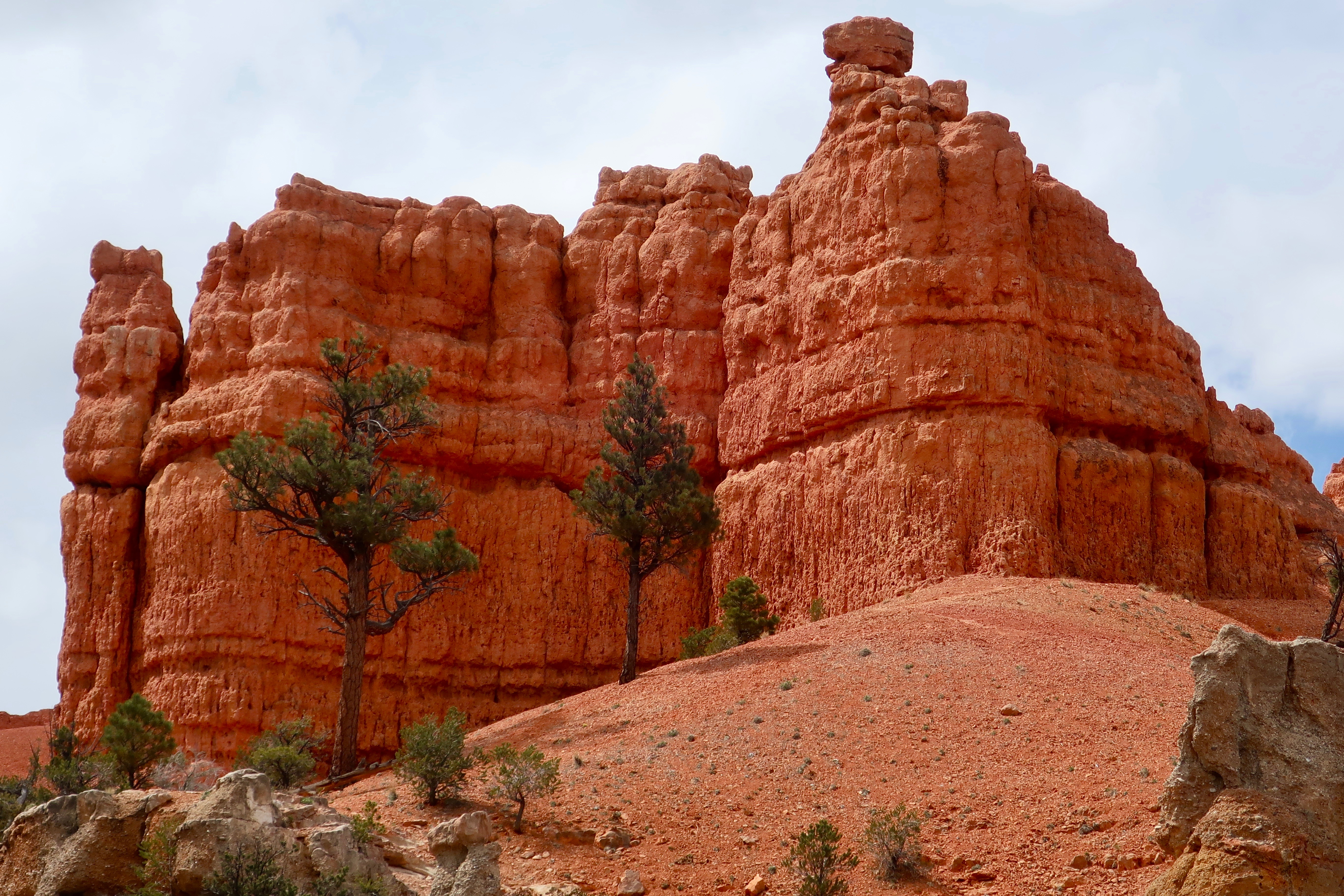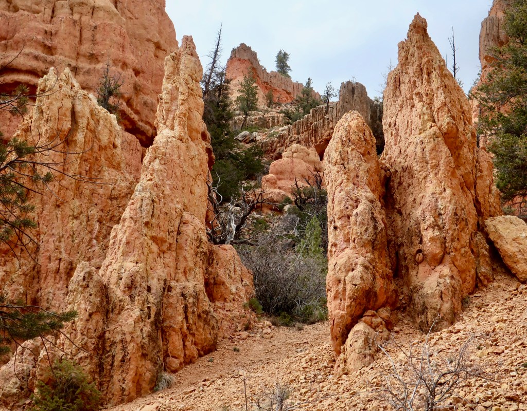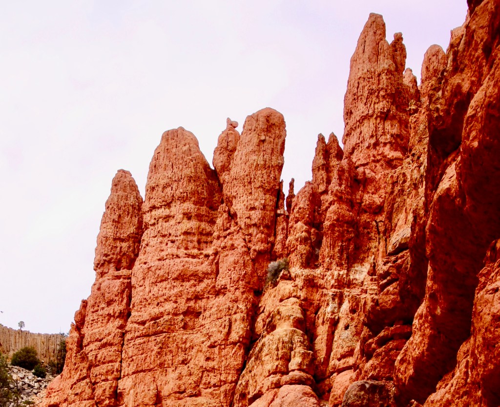 This is a typical view you can find in Red Canyon on a short walk. Expect to see pinnacles, spires, columns and hoodoos, the same things you will see in Bryce Canyon. But beware: You might get lonely. On our easy hour walk, Peggy and I only saw six other people.
