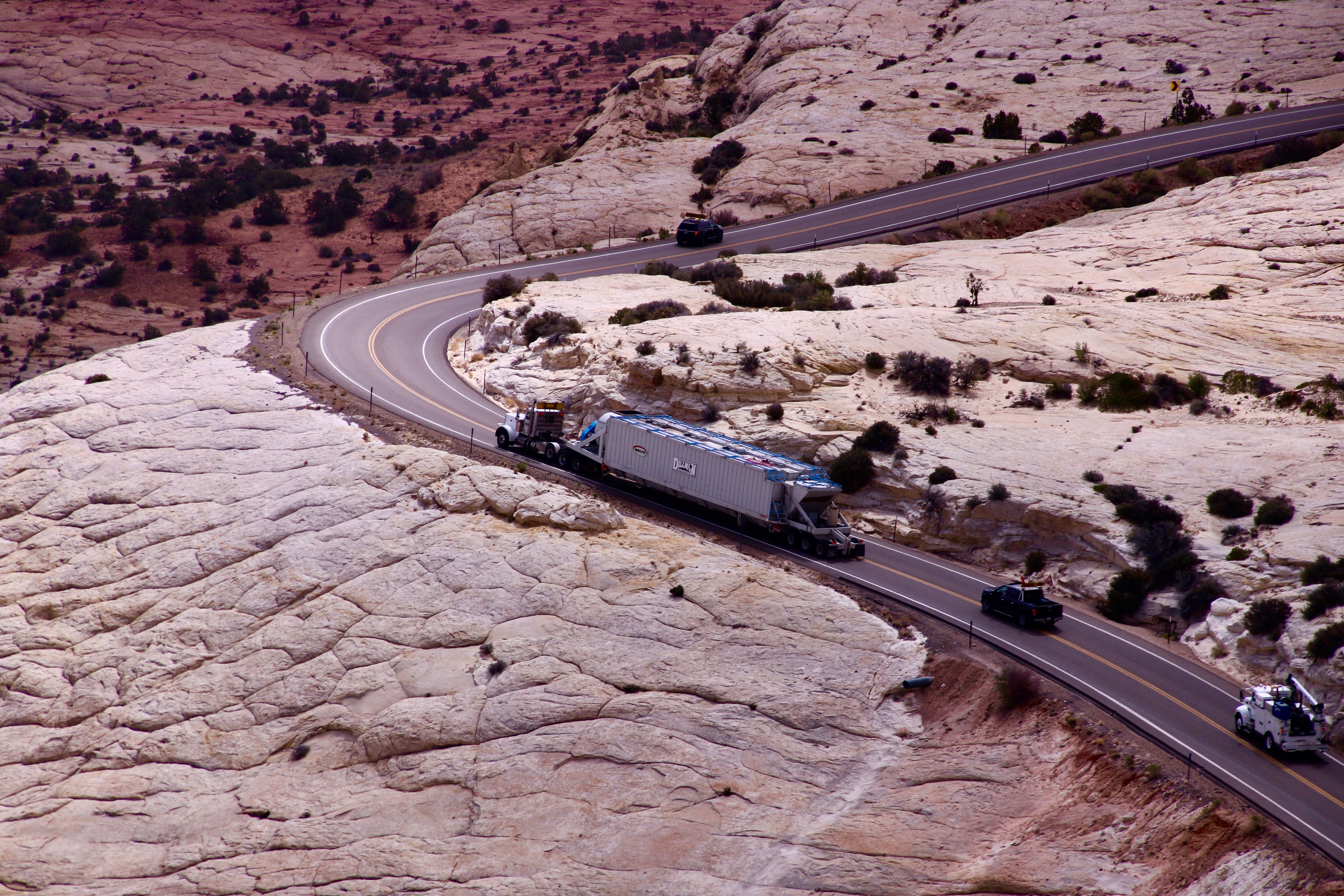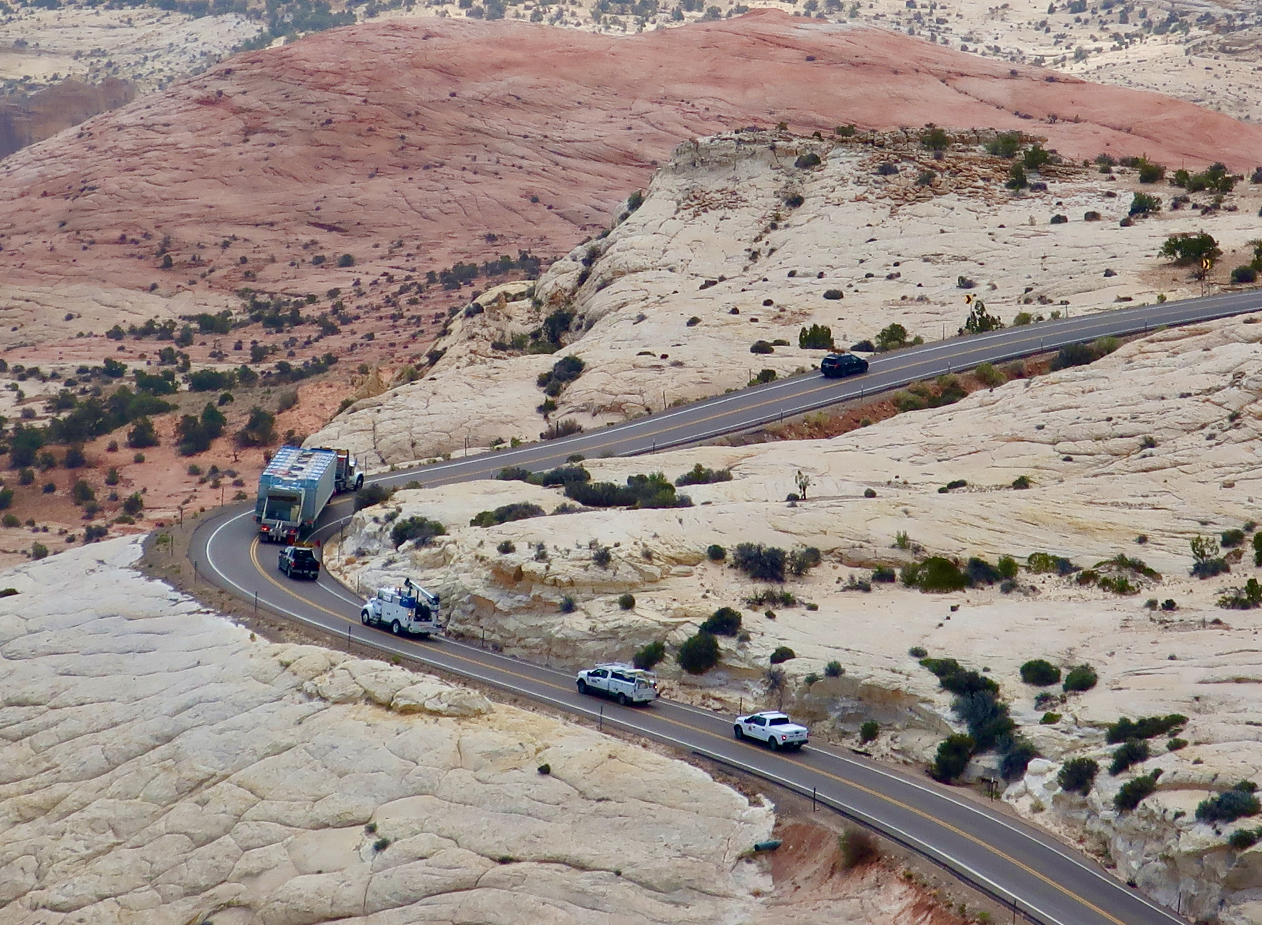 Carefully. The highway patrol had required folks coming down into the canyon (us, for example) to park off the road until the truck was past. Coming up, you waited behind the truck. No one passed that puppy!