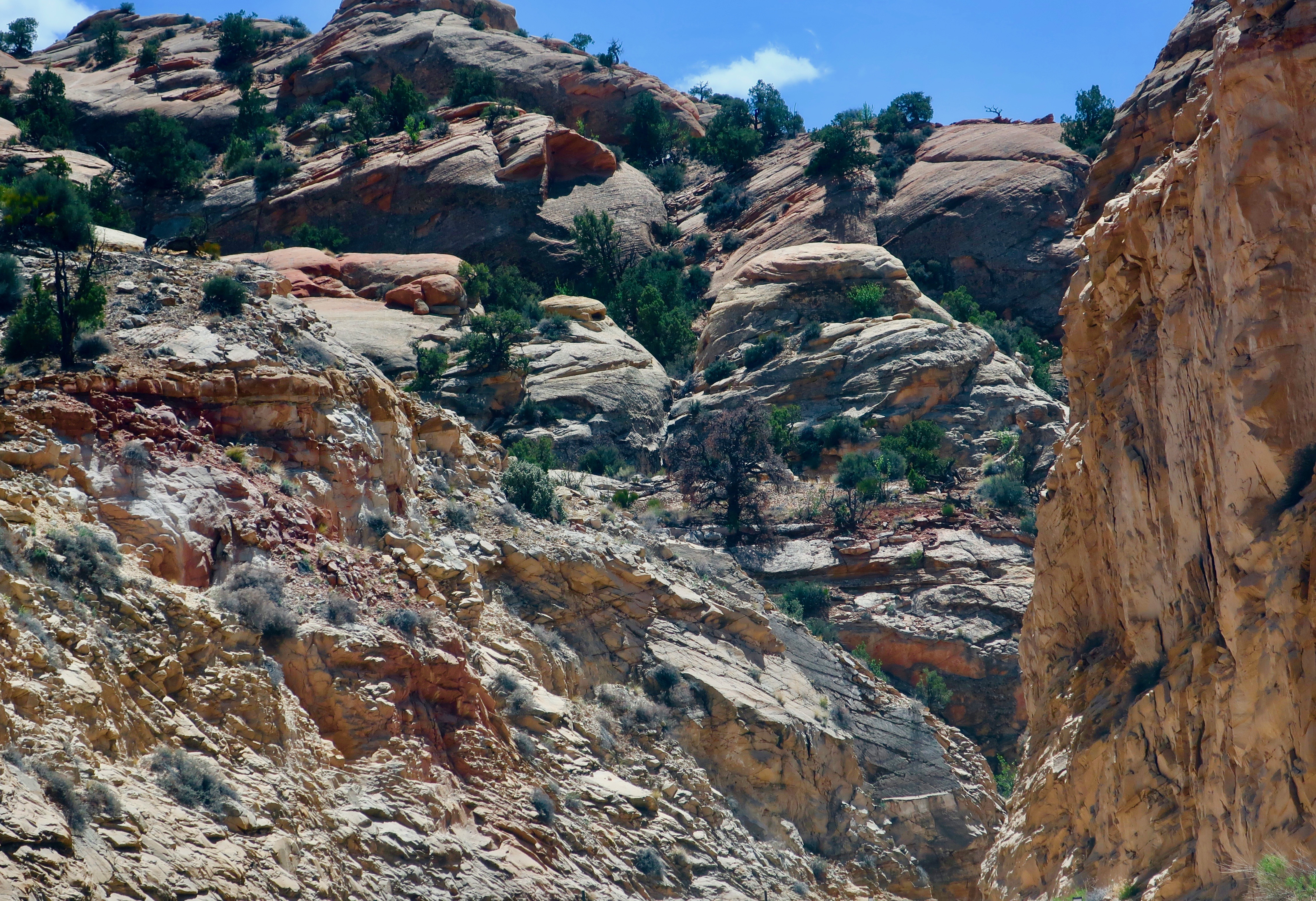 Our journey to Boulder can easily be divided into two parts: the section between Tropic and Escalante where we were mainly looking up, and the section between Escalante and Boulder, where we were mainly looking down. I’ve combined our morning and afternoon photos for each section, which is why you will see the varying light. We will start by looking up. 🙂