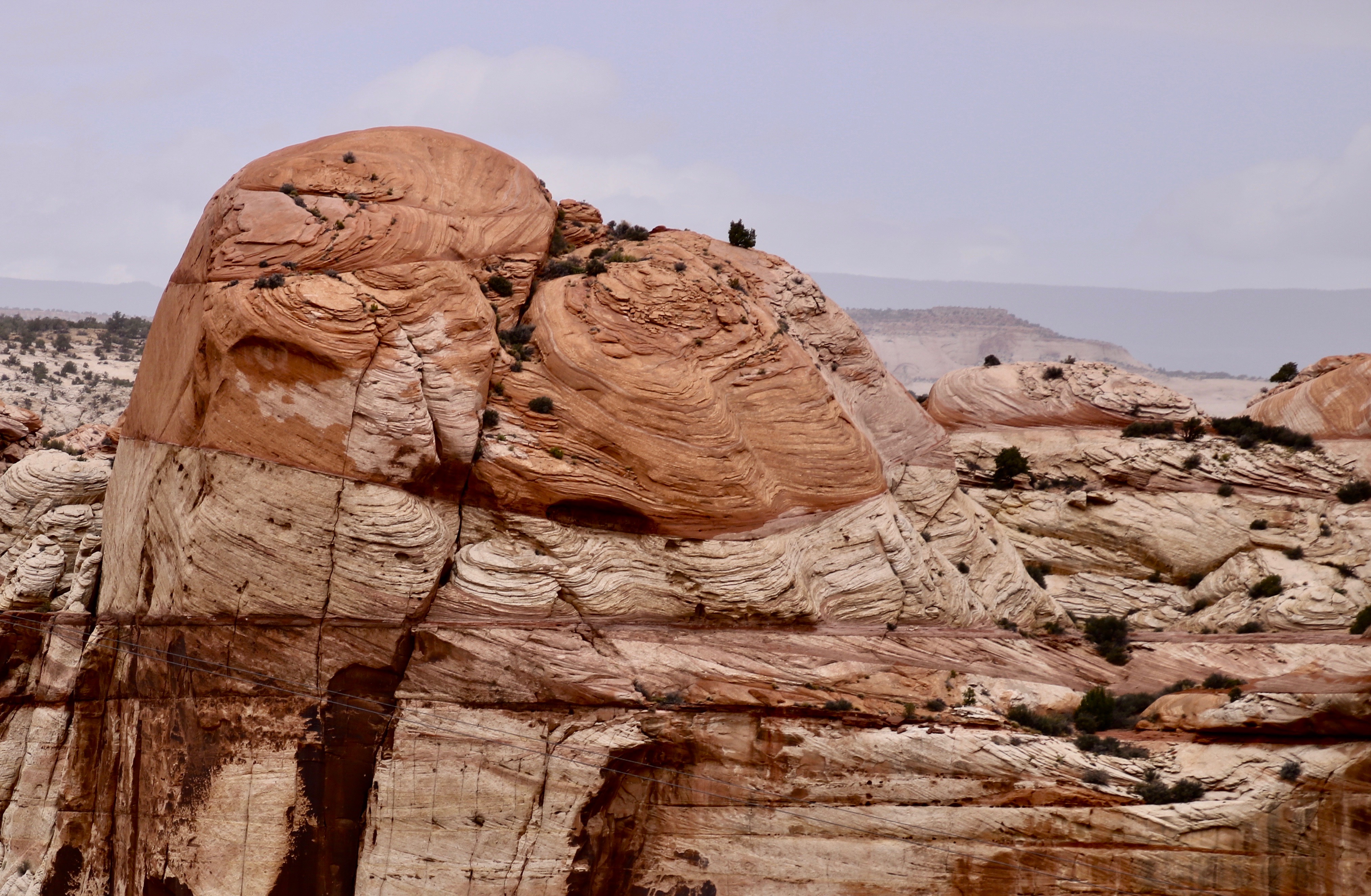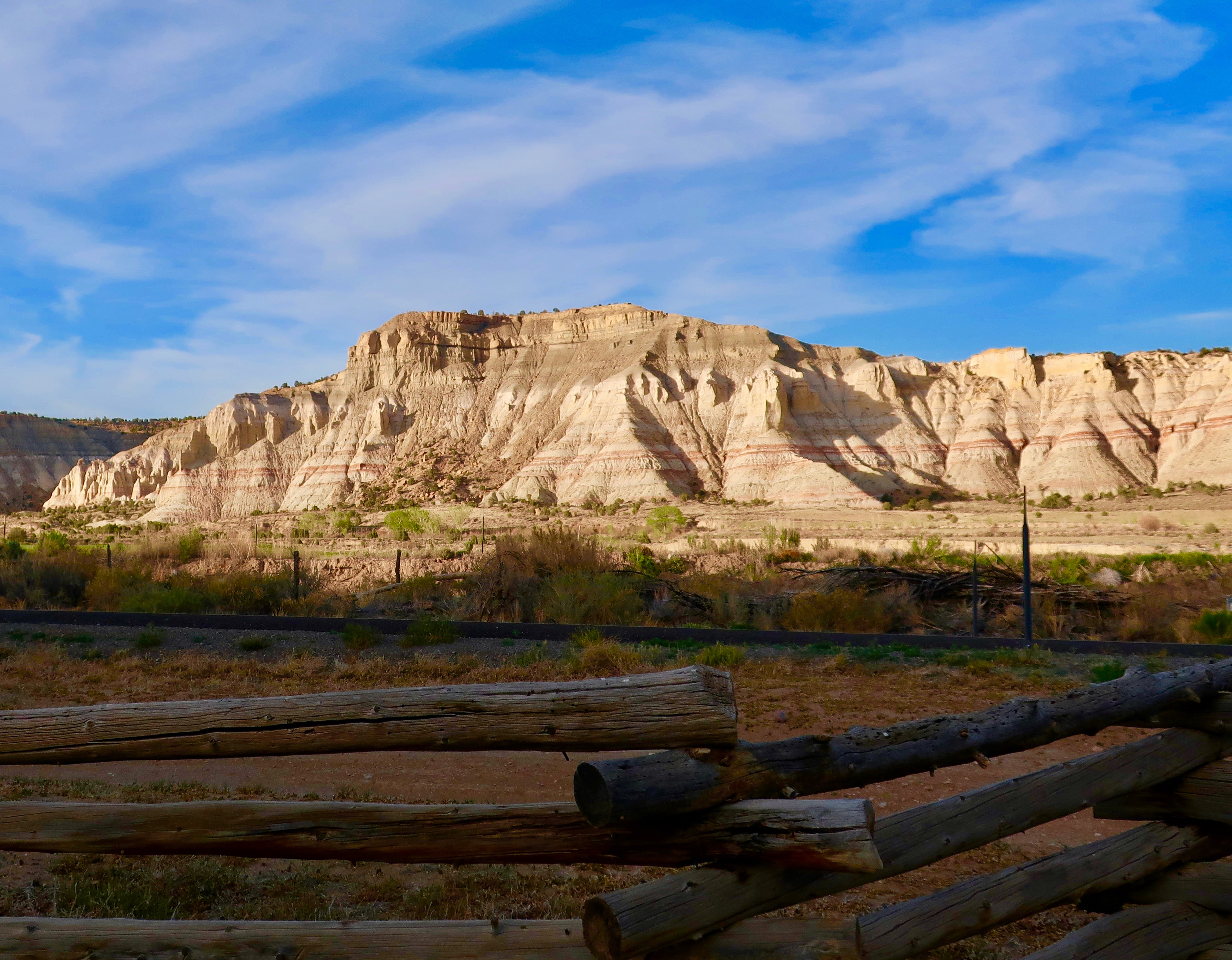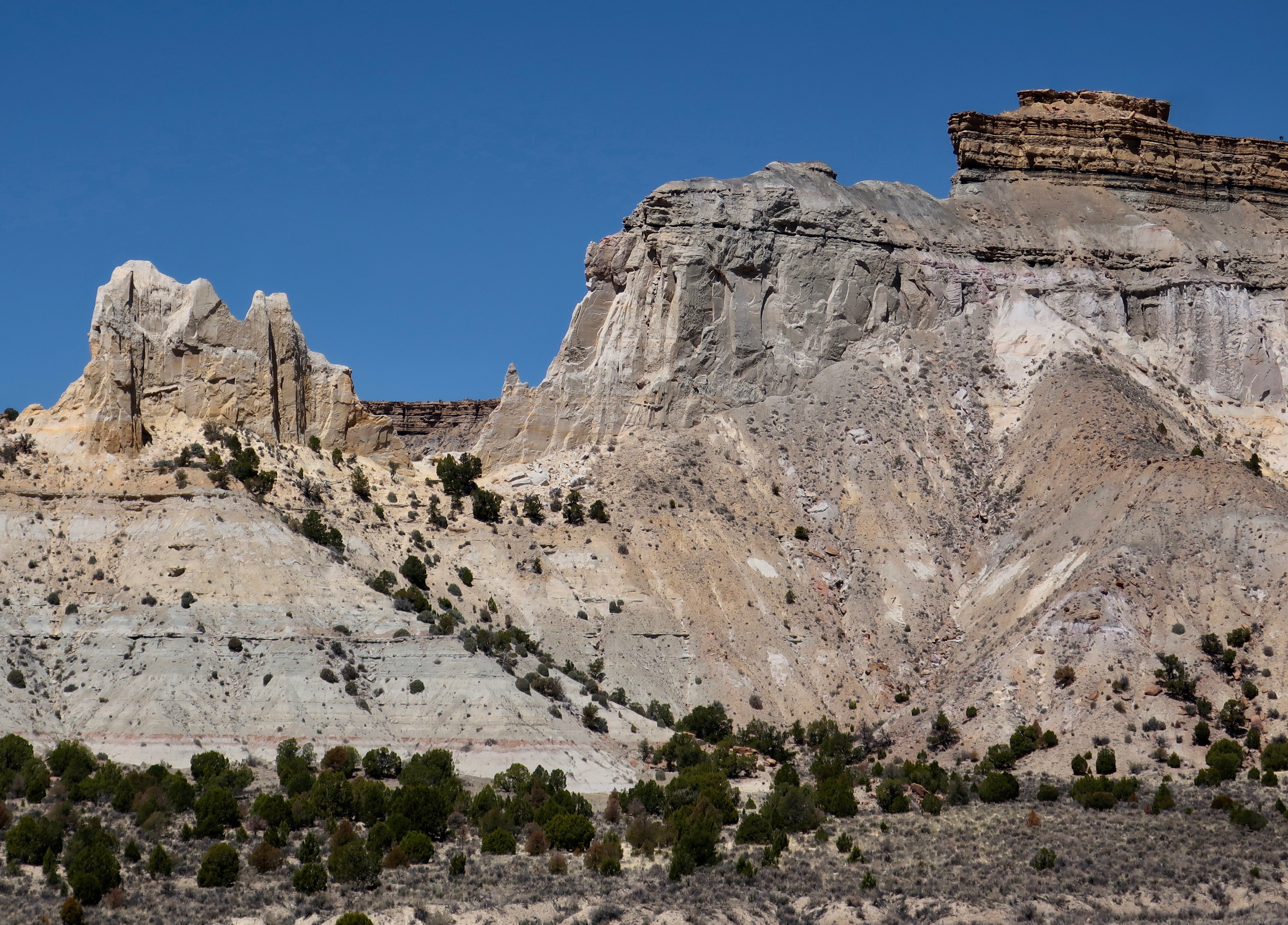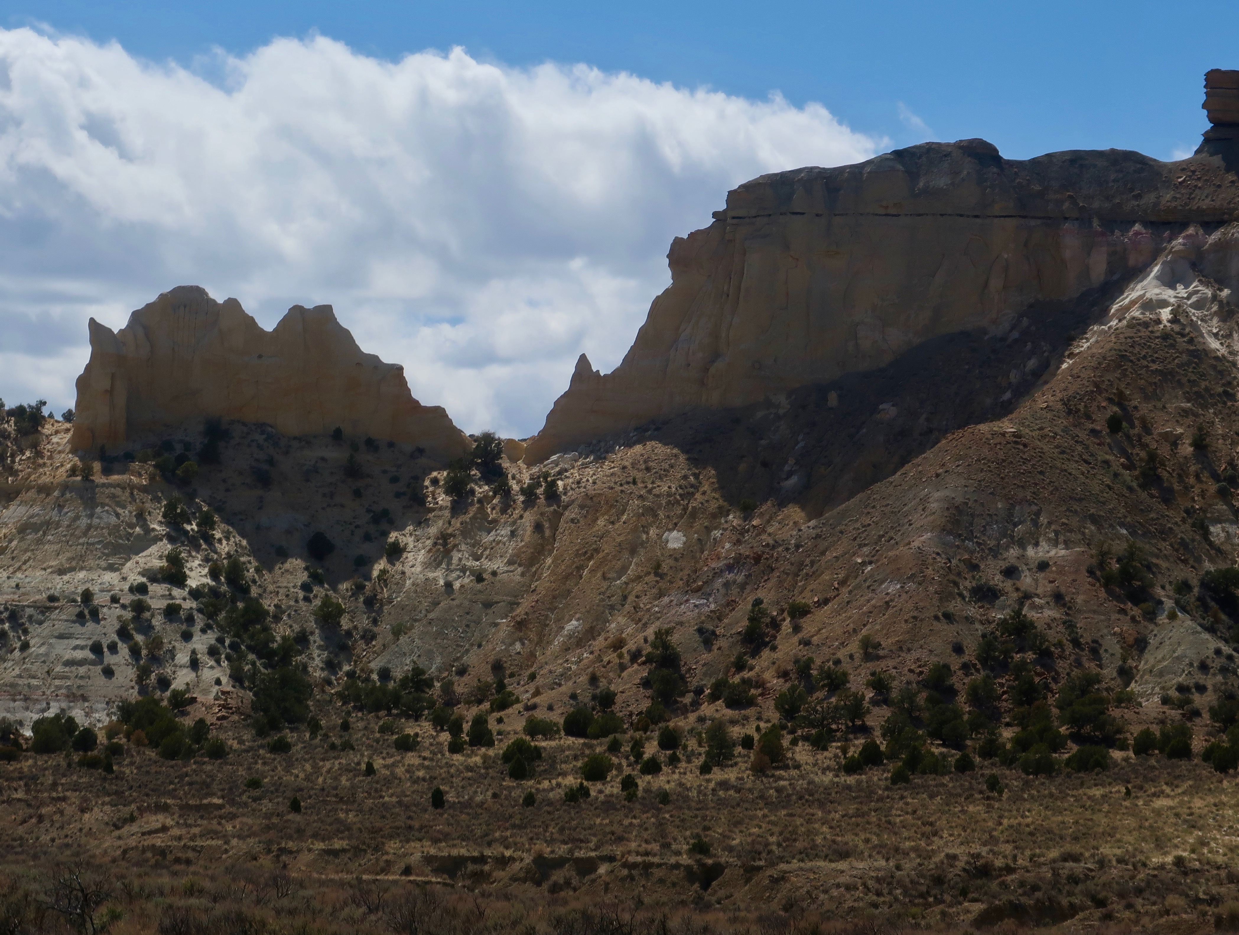 Dark skies with sun breaking through always make for dramatic photos. I’m not sure which was more impressive: The orange butte in the foreground, or the white one looming in the background.