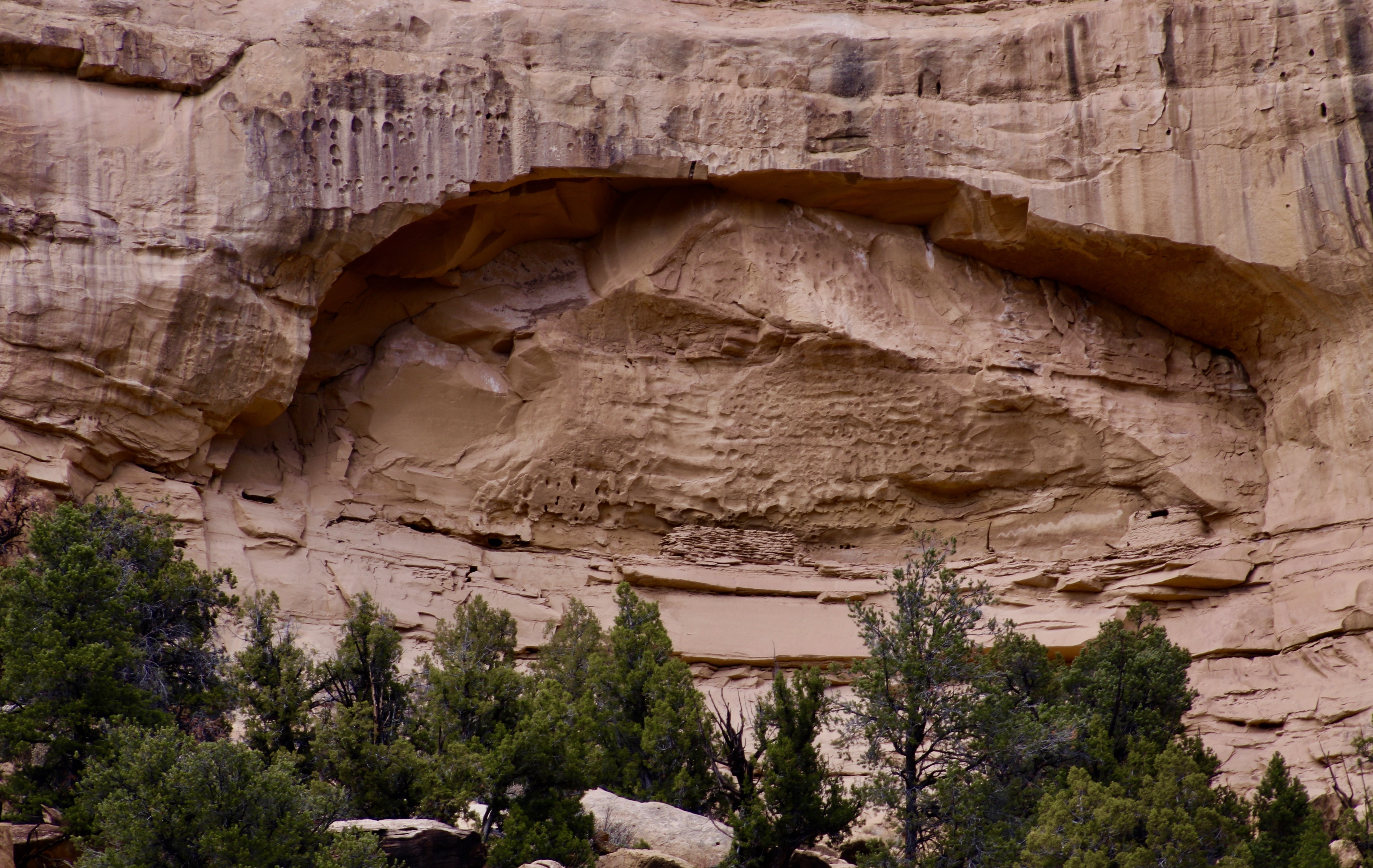 A quick look at the photo by Peggy here shows another example of erosion, possibly a future arch. But if you look more closely, you will see more: an ancient Puebloan granary. There are two structures here. People lived in this area for thousands of years before Europeans first made their way to North America.