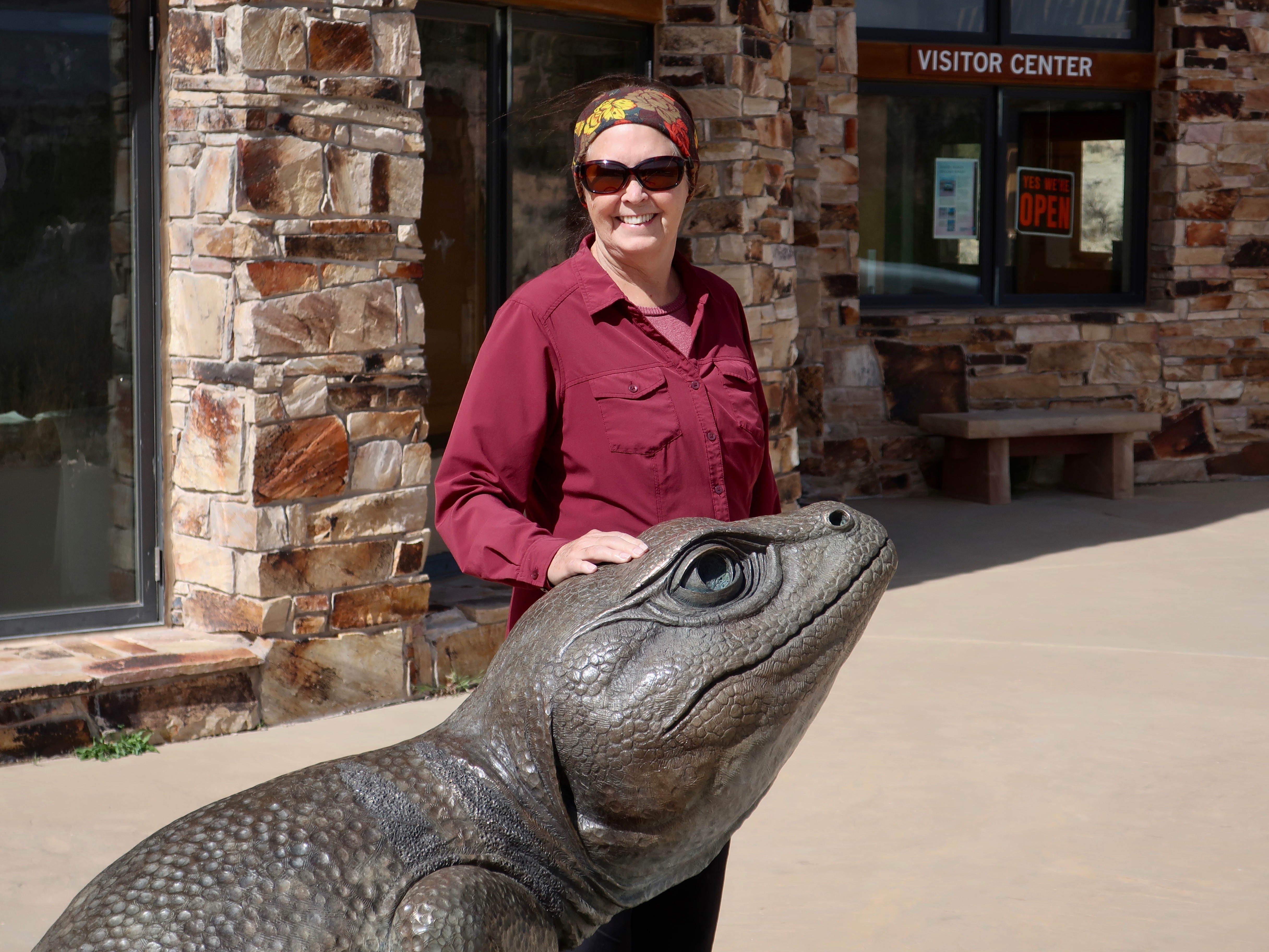 Peggy stopped to pet a large lizard in front of the Grand Staircase Escalante National Monument Visitor Center in the town of Escalante. A few miles later we were looking down into a vast canyon.
