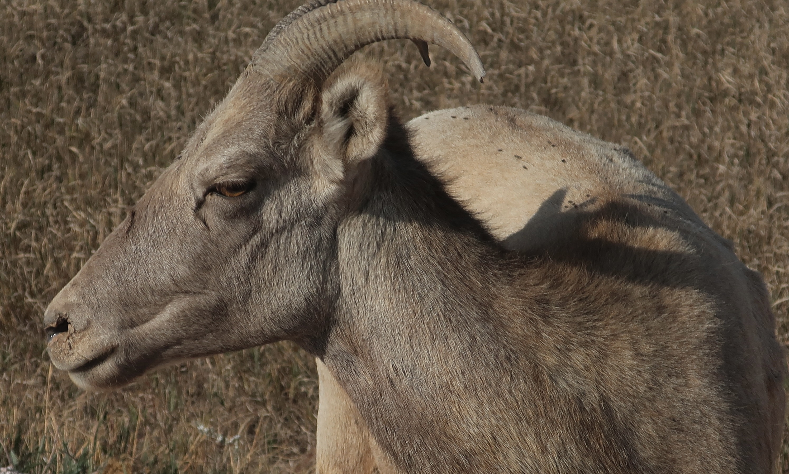 Photo of big horned sheep along Sage Road in Badlands NP by Curt Mekemson.