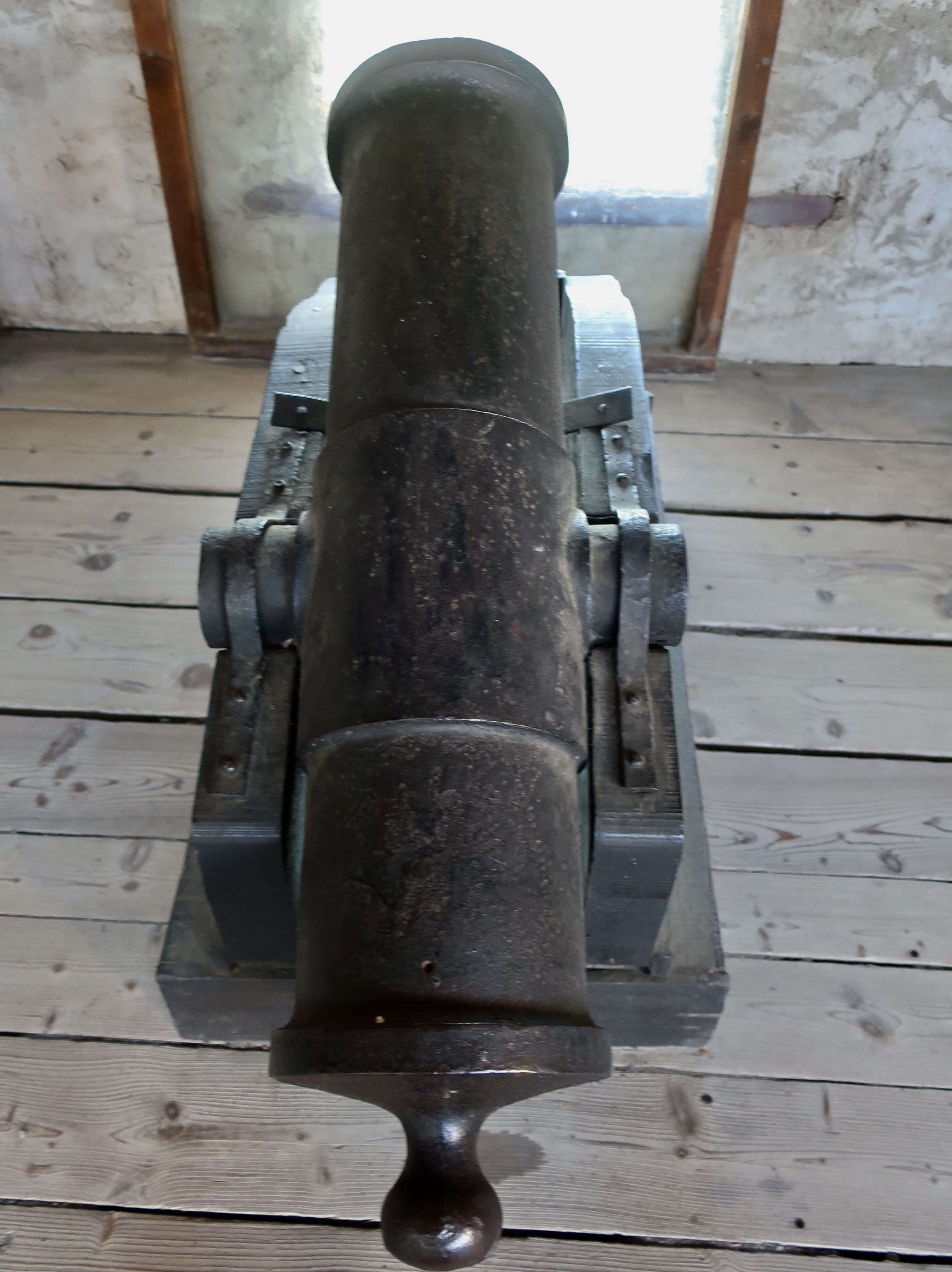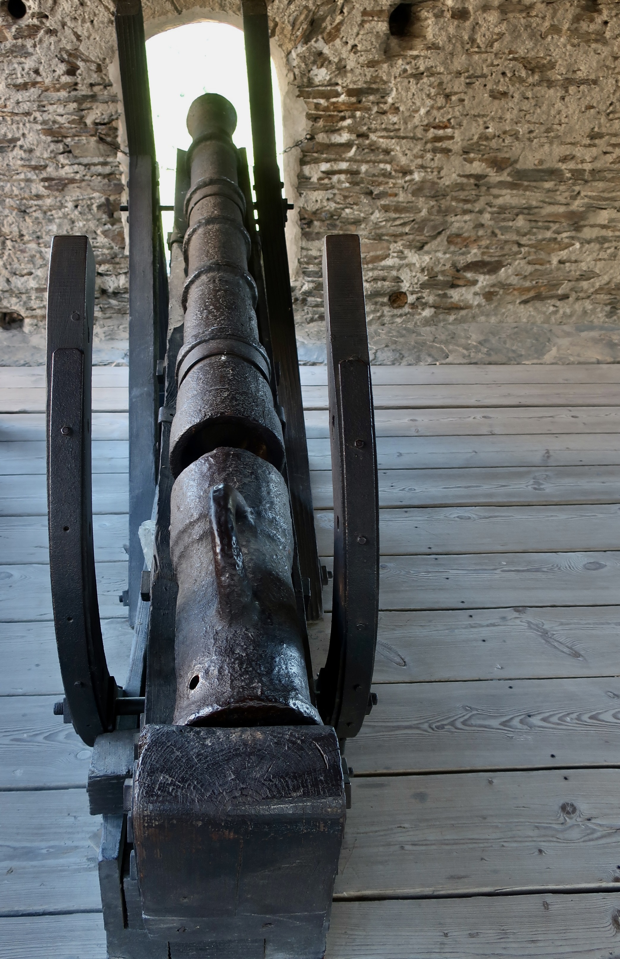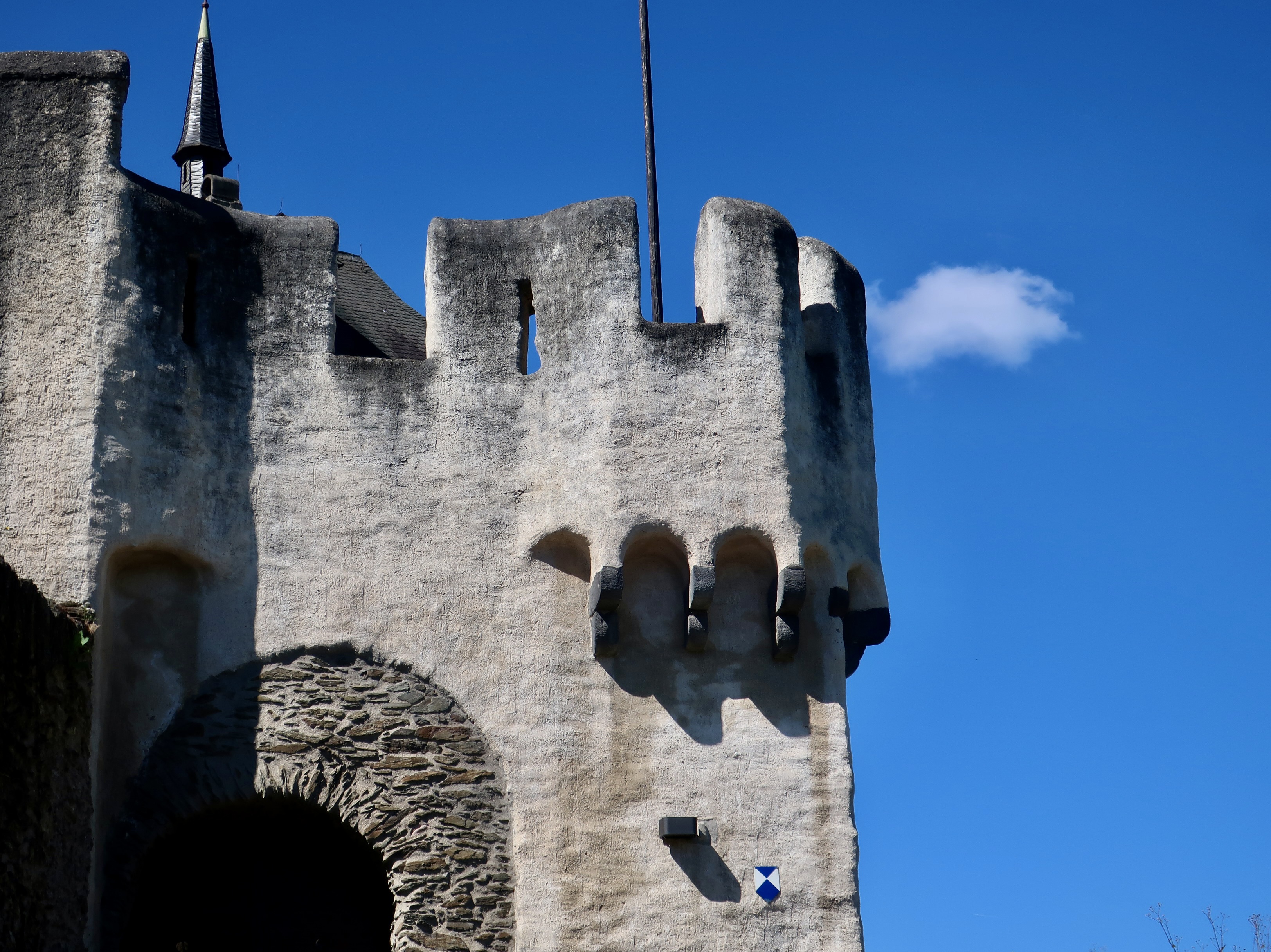 Just inside the massive entry door were four lions that represented the different noble families that had owned the castles. The lion is a common feature in heraldry representing courage, valor, strength, and other characteristics that nobles liked to claim they had, rightfully or not.While many of the castles along the Rhine were designed as homes for nobility first and defense second, Marksburg was designed first for protection. Its two towers were designed to fight off the enemy. Together, the two are commonly called a butter churn tower because of their look. (Photo by Peggy Mekemson.)A different perspective of the tower.Situated above the castle gate, these ramparts are designed to provide protection for the gate and surrounding walls.Anyone who has ever watched a movie involving castle defense understands the purpose of this structure. It’s designed to provide the defender with a clear line of fire while at the same time providing an element of protection. The long, slender hole in the right shadow is designed to shoot arrows through while providing even more protection.A close up of an arrow slit. Hard to get much more protection than this. Finding a target might be more of a problem! (Photo by Peggy Mekemson.)I found another use for the ramparts. They made a great frame for a photo.By the 1600s, cannons were in common use use as both defensive and offensive weapons in Europe. Marksburg had both short cannons and… …long cannons depending on the latest technology. (Photo by Peggy Mekemson.)The view of the Rhine through the cannon port. Rather commanding, I’d say. Before international agreements on Rhine River traffic were agreed to, a great deal of money was made by charging tolls to passing boats. Usually, a chain was stretched across the river. I have to assume that this was an added incentive to pay up.The armory included a number of wicked looking weapons including these. The shadows are even scarier. (Photo by Peggy Mekemson.)Even more interesting, there was display on the evolution of what knights wore. This one carried a huge broadsword. Interesting helmet. Eyebrows and a beak. Just ducky? (Photo by Peggy Mekemson.)Horny?Furry? Flowery. Okay, here’s the question. Assuming you needed a hero to represent you on the field of battle, which one would you choose: Ducky, Horny, Furry, or Flowery? (Photo by Peggy Mekemson.)Moving right along… how about the lives of the rich and famous in Marksburg Castle. I’m not sure they grew artichokes but we found this one blooming outside. BTW, our niece fed us artichokes for dinner when we visited her last week. We both love artichokes, but we had never made a complete dinner out of them. (Photo by Peggy Mekemson.)A variety of spices, I assume were representative of ones used during the Middle Ages, were hanging in the kitchen.As were a variety of cleavers. Chop chop!The bedroom featured this bed, which struck me as short and uncomfortable. It was designed for privacy, however.Possibly a little romantic music is called for. The instrument, BTW, is a hurdy-gurdy. I looked it up. Peggy informed me there was a musical group in the late 60s called the Hurdy Gurdy Band. (Photo by Peggy Mekemson.)Romantic love grew out of the age of Chivalry. What better way to recognize it than on a tapestry. This lovely maiden and her dandy duke seem to be sharing a moment as their beasties’ tails entwine to form a heart. Not quite sure what role the ferocious bird on the maiden’s right represents. Maybe it’s a message to the duke not to trifle with her emotions. Kind of like “If you dump me, I’ll stork you.”If marriage is in the future, the castle has a chapel, complete with Madonna who has lost her hand.And this is what I could only assume was a flying nun who has lost her bottom. If you are old enough, you may remember the TV series: The Flying Nun. (Photo by Peggy Mekemson.)We found the chapel’s ceiling quite impressive. Note the lion.No discussion of life in a medieval castle is complete without a discussion of the garderobe. “The what?” you say. It’s the small room hanging out over the wall. I call it the throne room. Peggy got a photo from inside.FYI, the garderobe was the medieval equivalent of an outdoor toilet. Aren’t you glad you asked. It could get rather cold on a wintry day. And you never, ever wanted to stand under one, which made me wonder what it was doing hanging over a gate. Maybe it was a defensive measure. Grin. (Photo by Peggy Mekemson.)