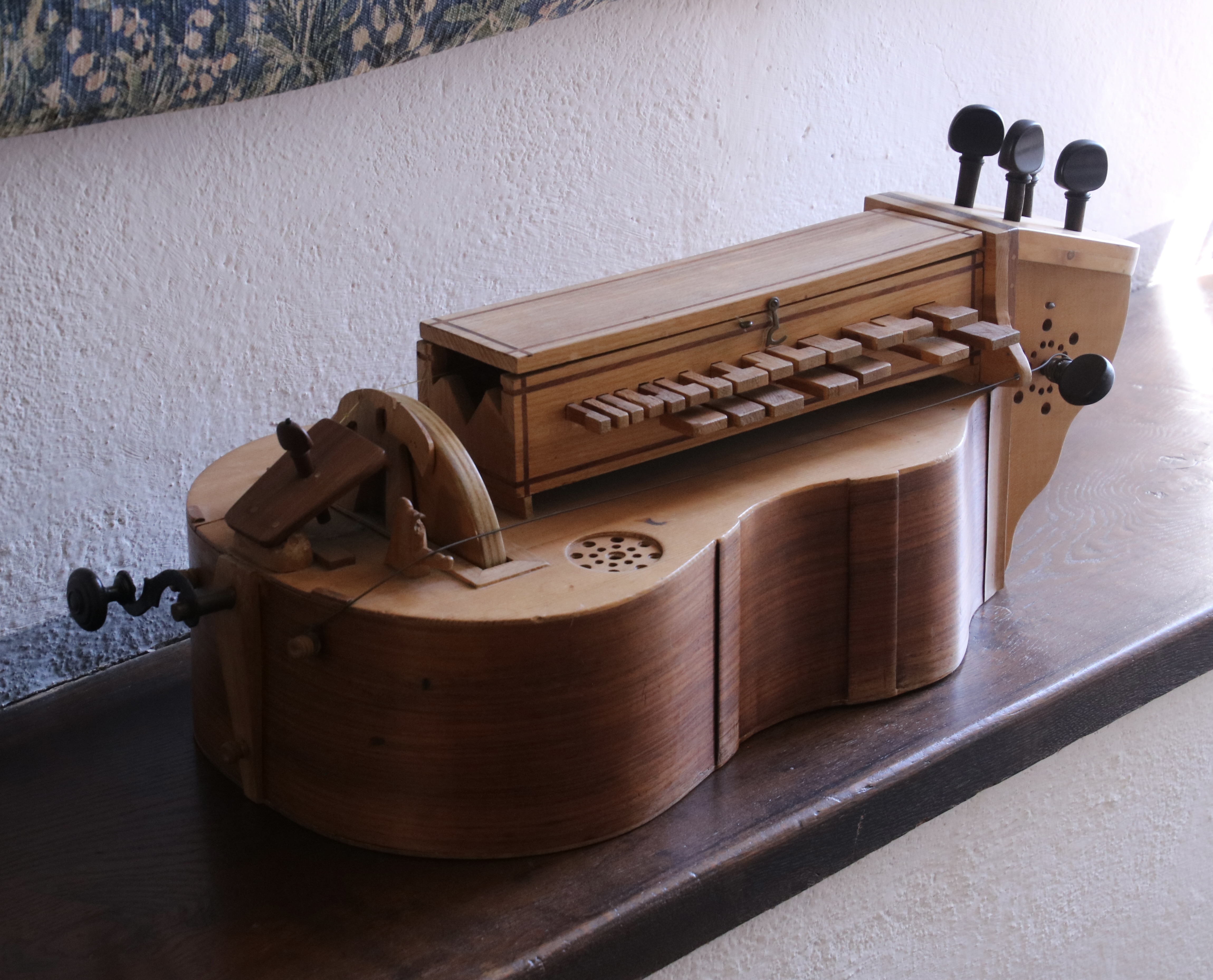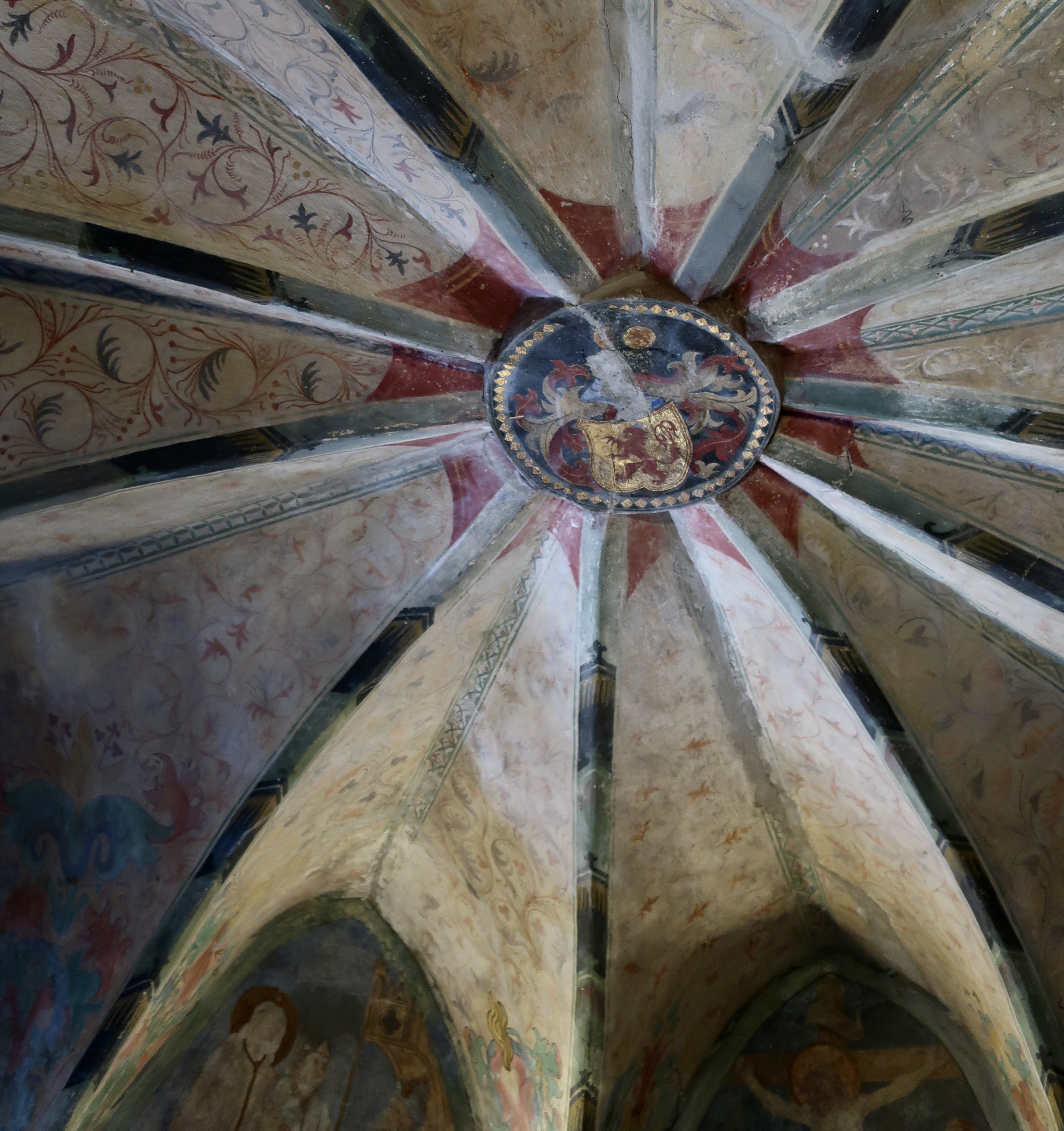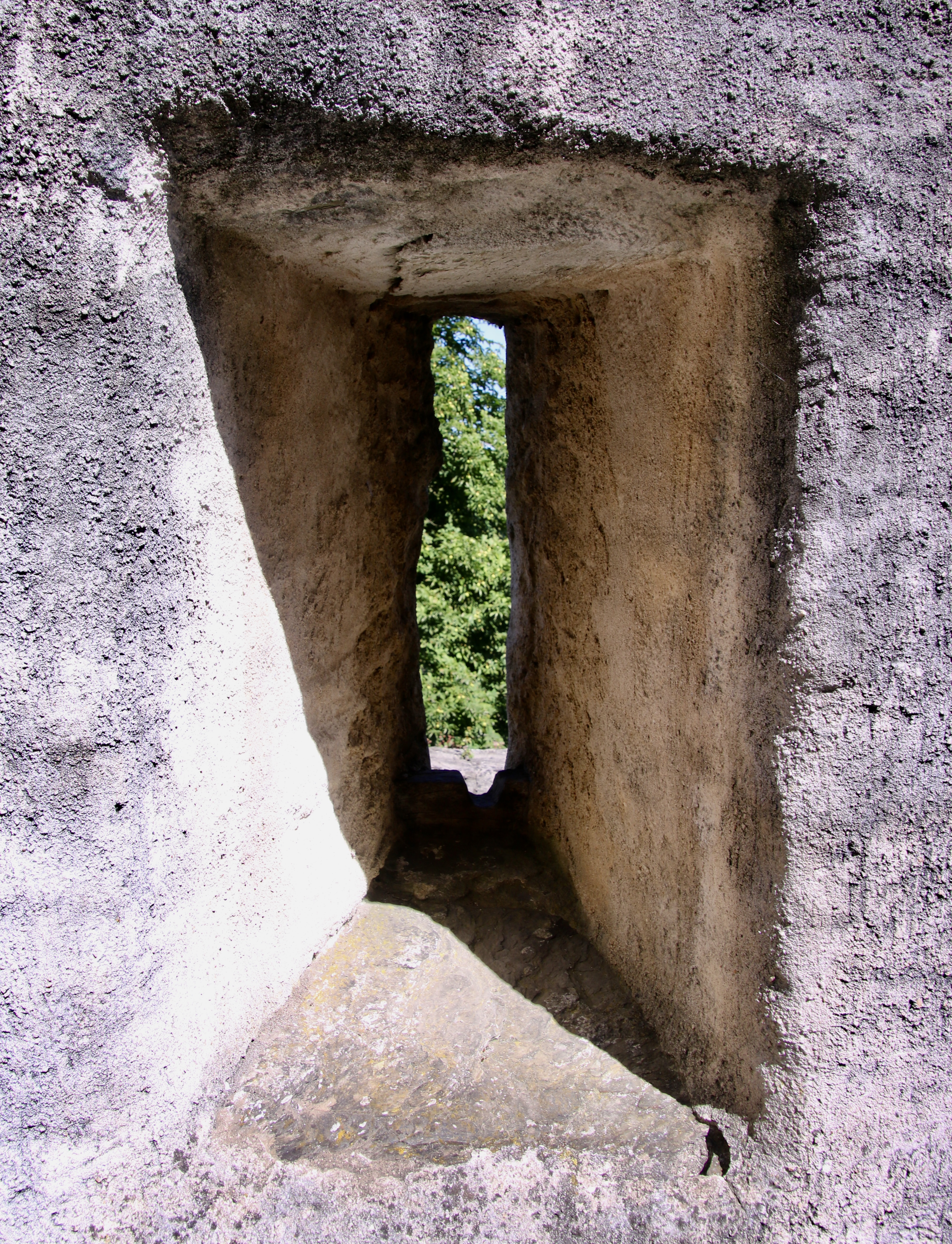 Just inside the massive entry door were four lions that represented the different noble families that had owned the castles. The lion is a common feature in heraldry representing courage, valor, strength, and other characteristics that nobles liked to claim they had, rightfully or not.While many of the castles along the Rhine were designed as homes for nobility first and defense second, Marksburg was designed first for protection. Its two towers were designed to fight off the enemy. Together, the two are commonly called a butter churn tower because of their look. (Photo by Peggy Mekemson.)A different perspective of the tower.Situated above the castle gate, these ramparts are designed to provide protection for the gate and surrounding walls.Anyone who has ever watched a movie involving castle defense understands the purpose of this structure. It’s designed to provide the defender with a clear line of fire while at the same time providing an element of protection. The long, slender hole in the right shadow is designed to shoot arrows through while providing even more protection.A close up of an arrow slit. Hard to get much more protection than this. Finding a target might be more of a problem! (Photo by Peggy Mekemson.)I found another use for the ramparts. They made a great frame for a photo.By the 1600s, cannons were in common use use as both defensive and offensive weapons in Europe. Marksburg had both short cannons and… …long cannons depending on the latest technology. (Photo by Peggy Mekemson.)The view of the Rhine through the cannon port. Rather commanding, I’d say. Before international agreements on Rhine River traffic were agreed to, a great deal of money was made by charging tolls to passing boats. Usually, a chain was stretched across the river. I have to assume that this was an added incentive to pay up.The armory included a number of wicked looking weapons including these. The shadows are even scarier. (Photo by Peggy Mekemson.)Even more interesting, there was display on the evolution of what knights wore. This one carried a huge broadsword. Interesting helmet. Eyebrows and a beak. Just ducky? (Photo by Peggy Mekemson.)Horny?Furry? Flowery. Okay, here’s the question. Assuming you needed a hero to represent you on the field of battle, which one would you choose: Ducky, Horny, Furry, or Flowery? (Photo by Peggy Mekemson.)Moving right along… how about the lives of the rich and famous in Marksburg Castle. I’m not sure they grew artichokes but we found this one blooming outside. BTW, our niece fed us artichokes for dinner when we visited her last week. We both love artichokes, but we had never made a complete dinner out of them. (Photo by Peggy Mekemson.)A variety of spices, I assume were representative of ones used during the Middle Ages, were hanging in the kitchen.As were a variety of cleavers. Chop chop!The bedroom featured this bed, which struck me as short and uncomfortable. It was designed for privacy, however.Possibly a little romantic music is called for. The instrument, BTW, is a hurdy-gurdy. I looked it up. Peggy informed me there was a musical group in the late 60s called the Hurdy Gurdy Band. (Photo by Peggy Mekemson.)Romantic love grew out of the age of Chivalry. What better way to recognize it than on a tapestry. This lovely maiden and her dandy duke seem to be sharing a moment as their beasties’ tails entwine to form a heart. Not quite sure what role the ferocious bird on the maiden’s right represents. Maybe it’s a message to the duke not to trifle with her emotions. Kind of like “If you dump me, I’ll stork you.”If marriage is in the future, the castle has a chapel, complete with Madonna who has lost her hand.And this is what I could only assume was a flying nun who has lost her bottom. If you are old enough, you may remember the TV series: The Flying Nun. (Photo by Peggy Mekemson.)We found the chapel’s ceiling quite impressive. Note the lion.No discussion of life in a medieval castle is complete without a discussion of the garderobe. “The what?” you say. It’s the small room hanging out over the wall. I call it the throne room. Peggy got a photo from inside.FYI, the garderobe was the medieval equivalent of an outdoor toilet. Aren’t you glad you asked. It could get rather cold on a wintry day. And you never, ever wanted to stand under one, which made me wonder what it was doing hanging over a gate. Maybe it was a defensive measure. Grin. (Photo by Peggy Mekemson.)