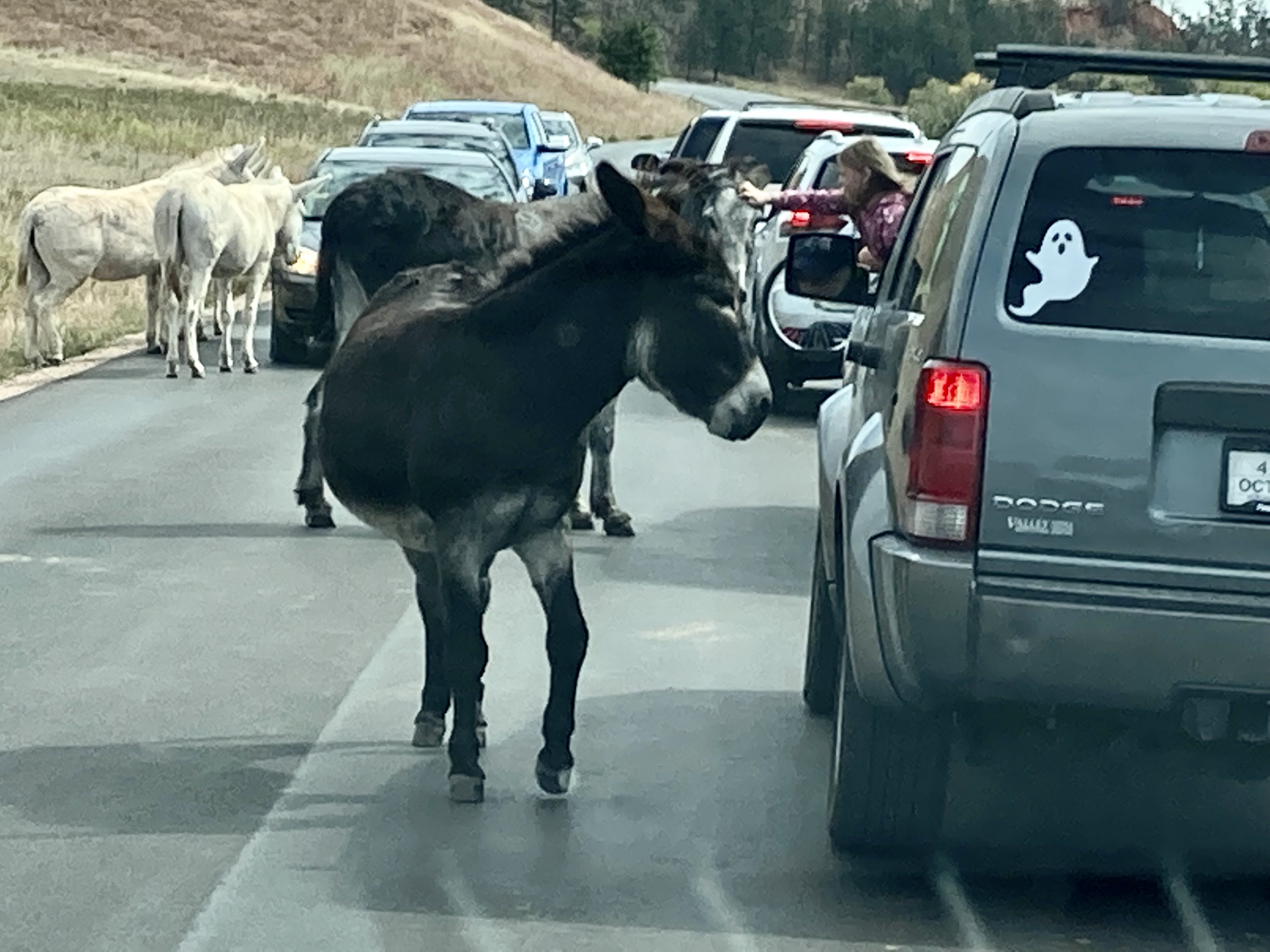 I’ve never thought of wild burros as being bad, much less scary, but I’d never met these guys. Here they were in South Dakota’s Custer State Park blocking the traffic, demanding booty. Sure, buffalo blocked traffic as well. But they were merely crossing the road, exercising their prerogative to get from one side to the other. Slowly. The donkeys were bandits. Pure and simple.