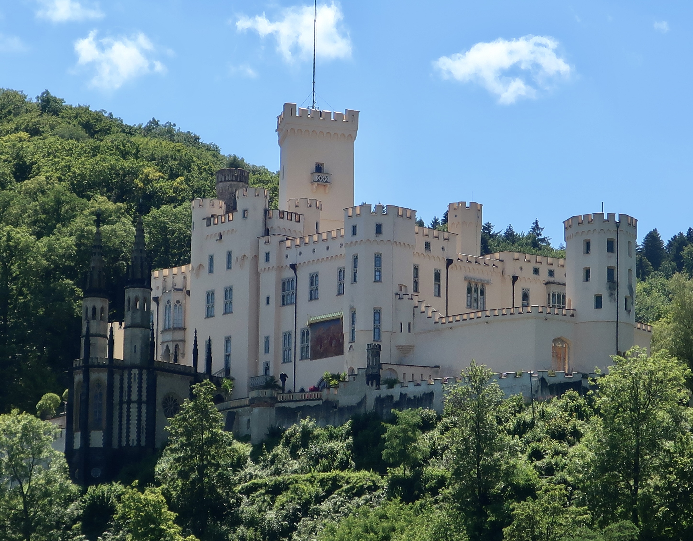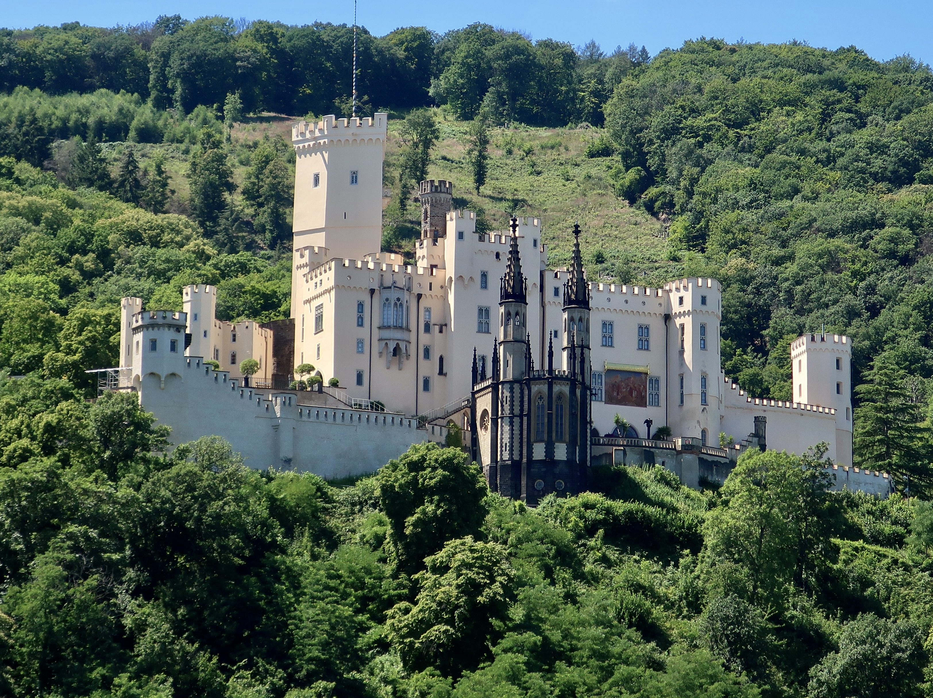 First up, on our list is Stolzenfels Palace. Originally built by the Bishop of Trier in 1259, it was destroyed by the French in 1689 during the Nine Years War, one of the seemingly endless wars that have been fought in Europe. In 1823 the ruins were given to Frederick William IV of Prussia who had the castle rebuilt by 1842 as his summer palace. The Gothic chapel in front was inaugurated in 1845 during a visit by Queen Victoria.