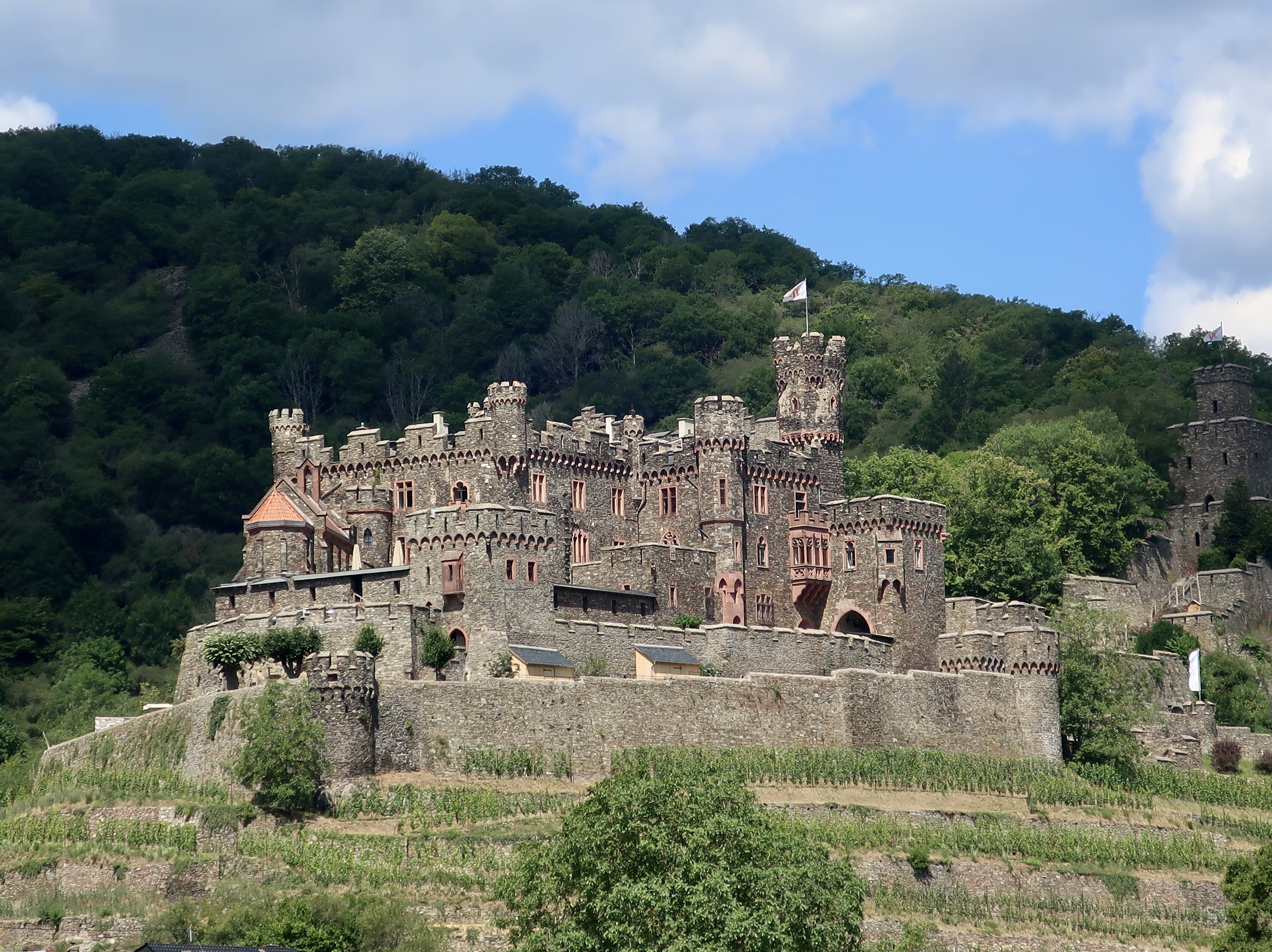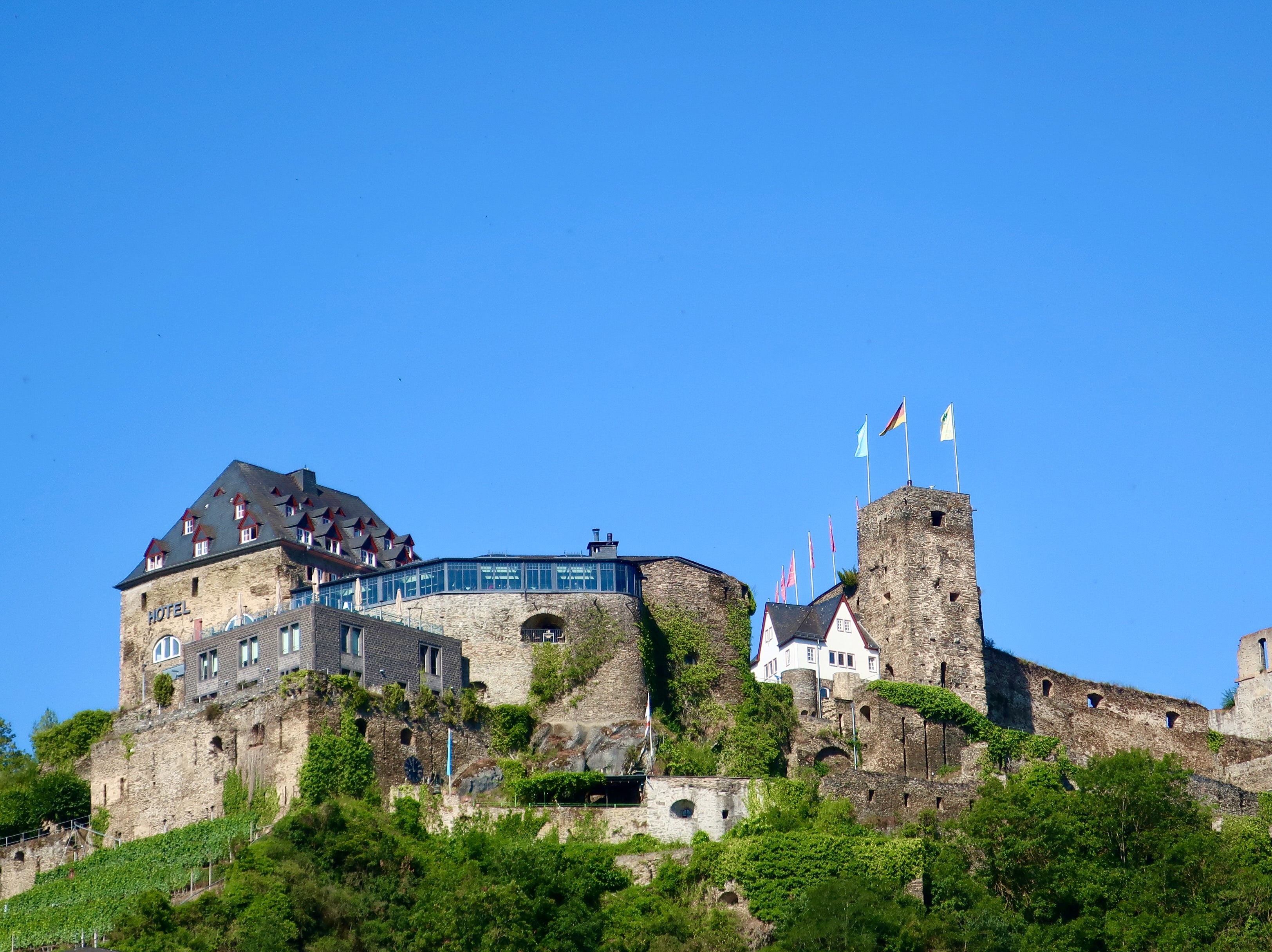 The Schönburg Castle, located near Pfalz Castle, dates back to somewhere around 1000 CE. It was burned down by French Soldiers in 1689 and remained in ruins until the late 1800s when it was bought from the nearby town of Oberwesel by an American family and restored. Ancestors of the appropriately named Rhinelander family had come from the region in the 1600s to the US and made a fortune in real estate.